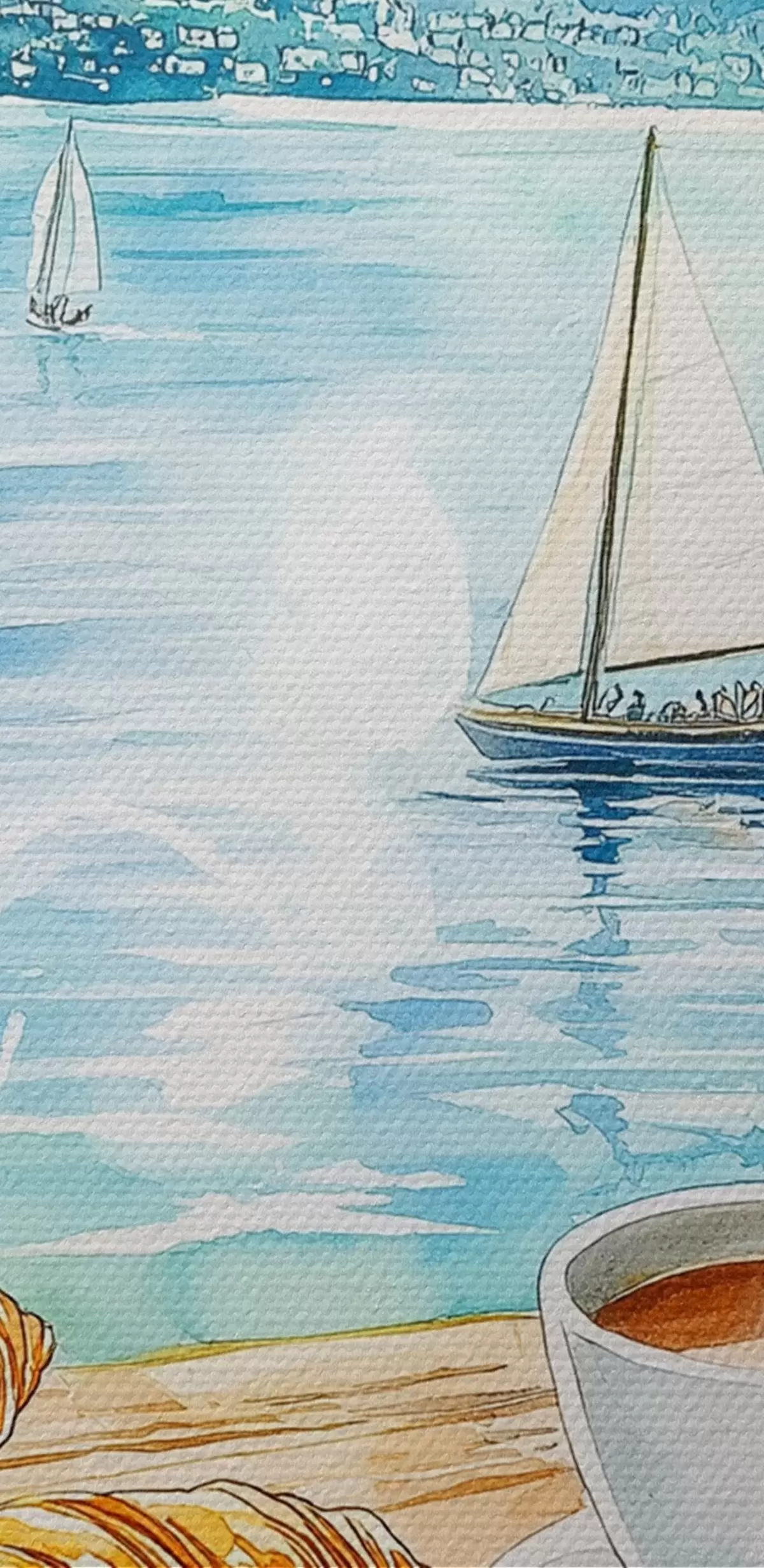 Tableau Lac d'été avec voiliers, tasses de café, croissants, style aquarelle Nr s42441