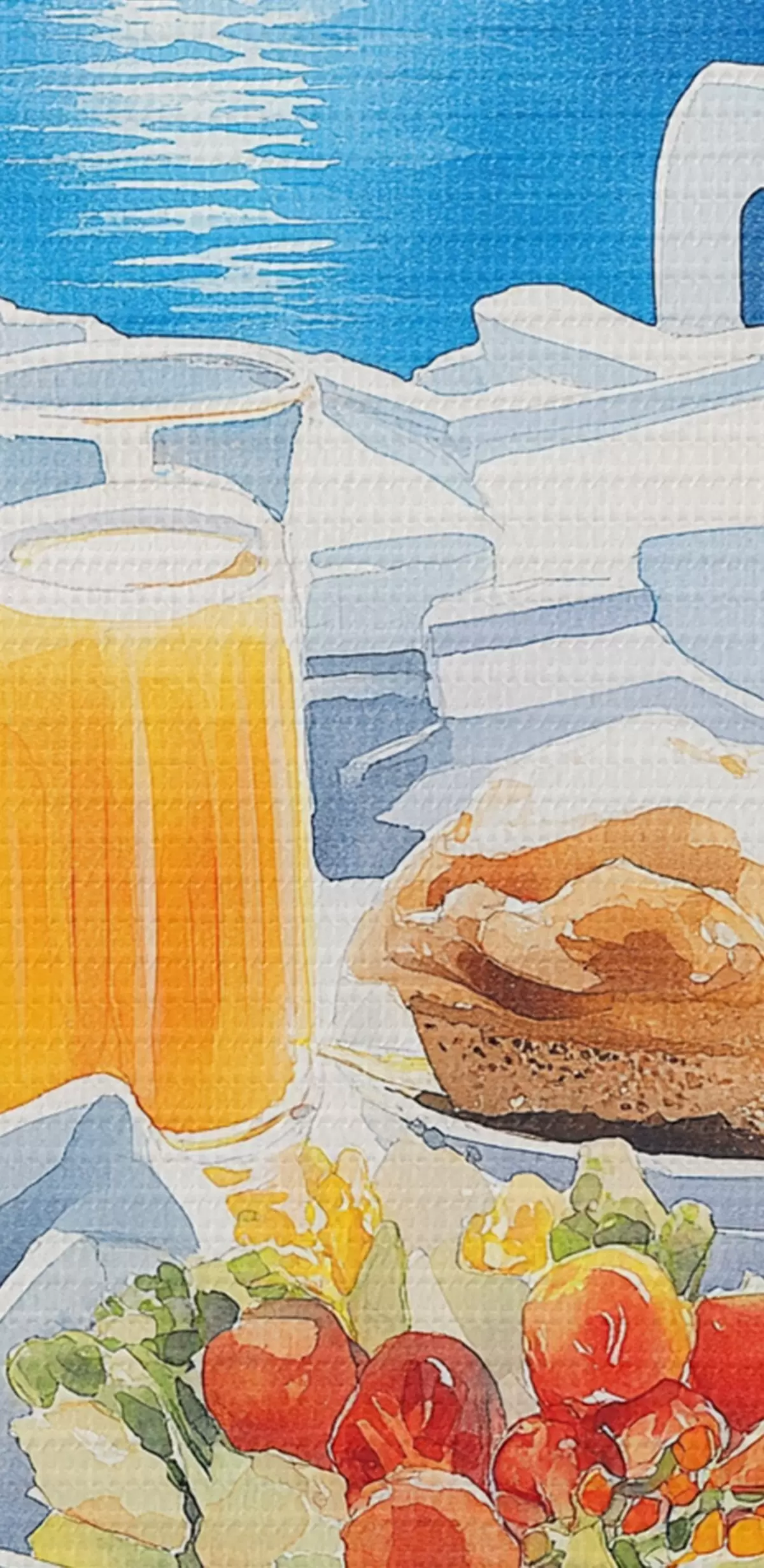 Tableau Paysages de Santorin, petit déjeuner, style aquarelle, vieille ville s42454