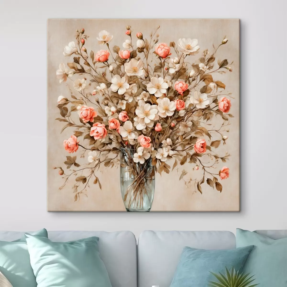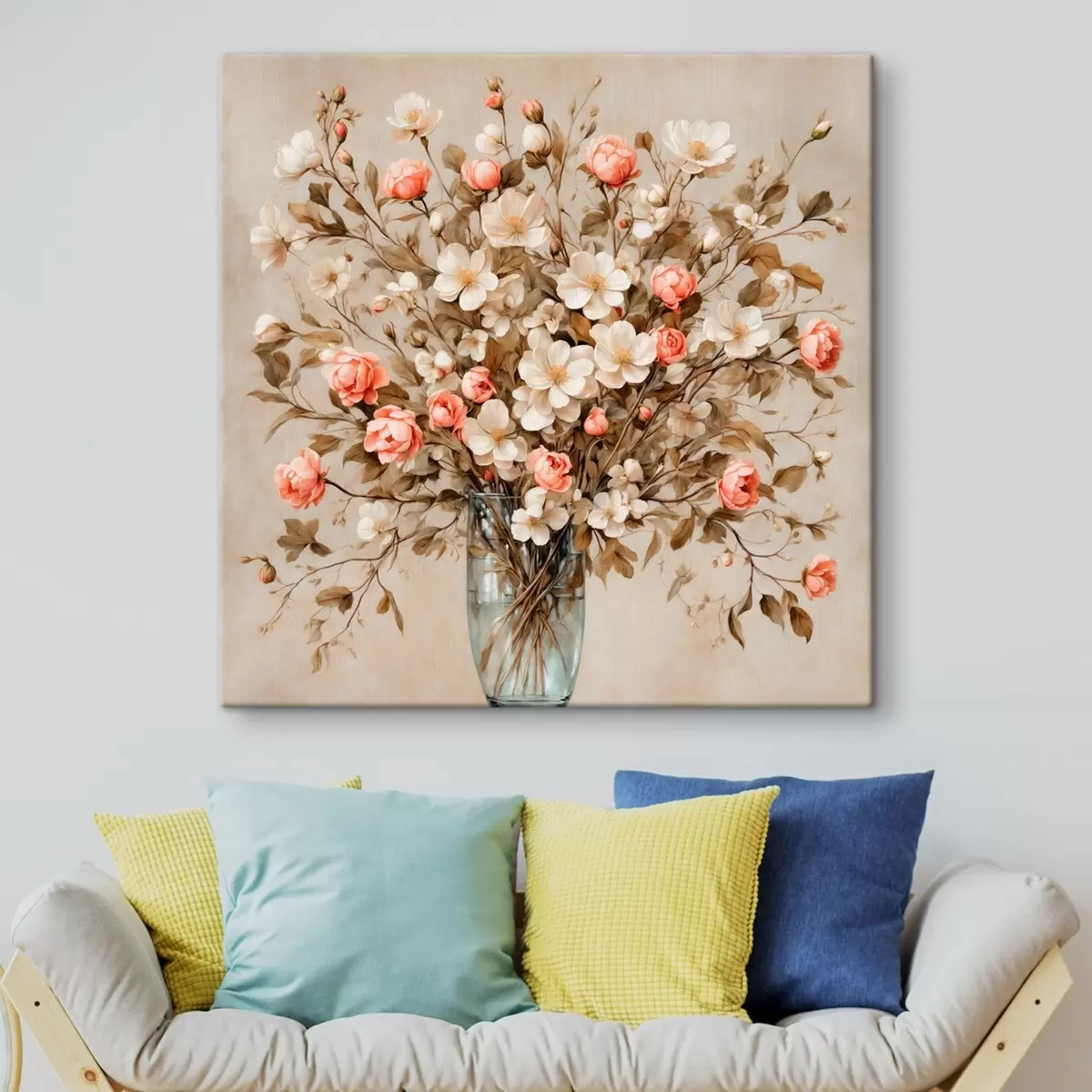 Tableau Fleurs dans un vase transparent sur fond beige s42534