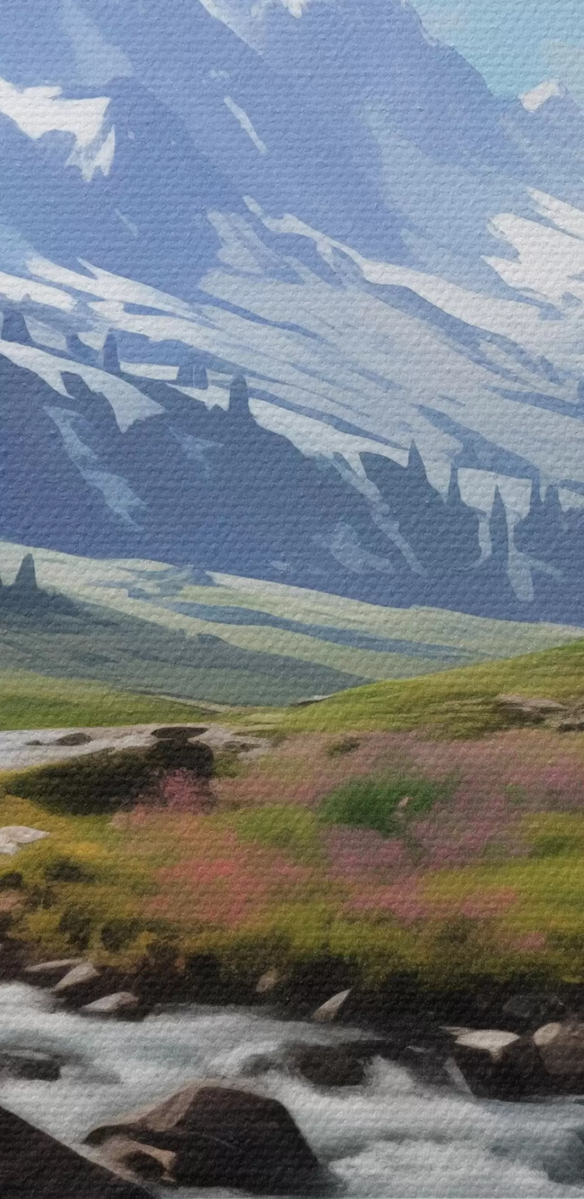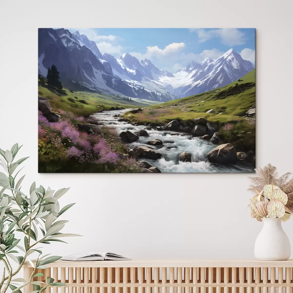 Tableau Un paysage de montagne avec un ruisseau qui coule, des prairies en fleurs et des sommets enneigés à l'horizon sous un ciel d'un bleu éclatant. Nr s42563