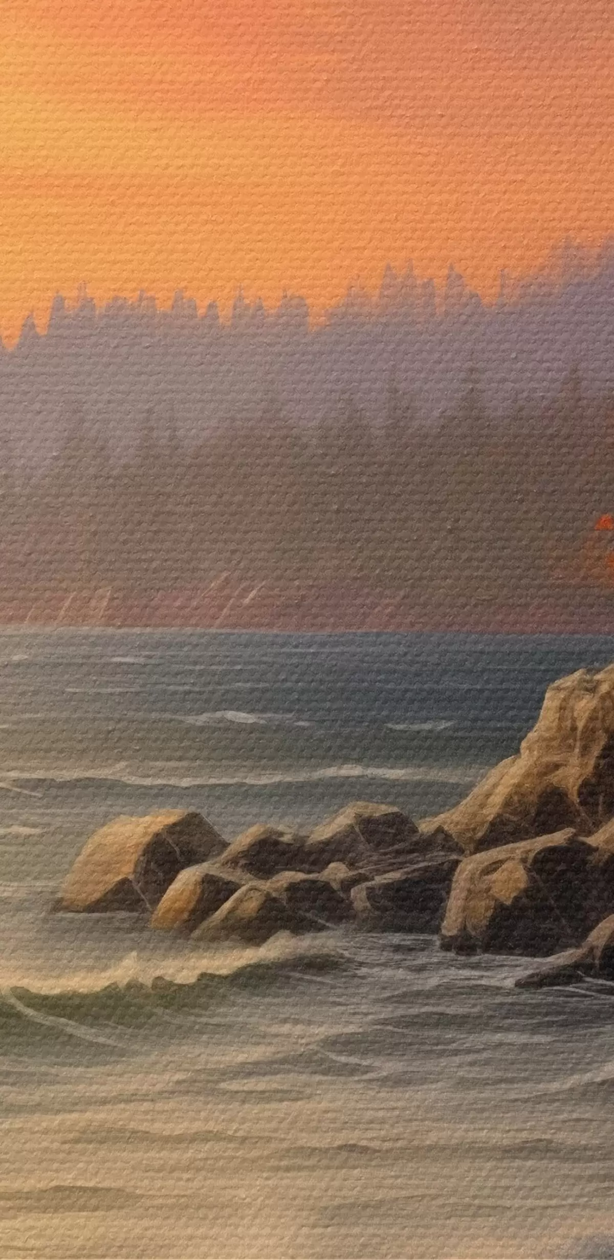Tableau Un coucher de soleil sur le bord de mer avec des vagues, une forêt de pins et des couleurs d'automne au premier plan. s42571