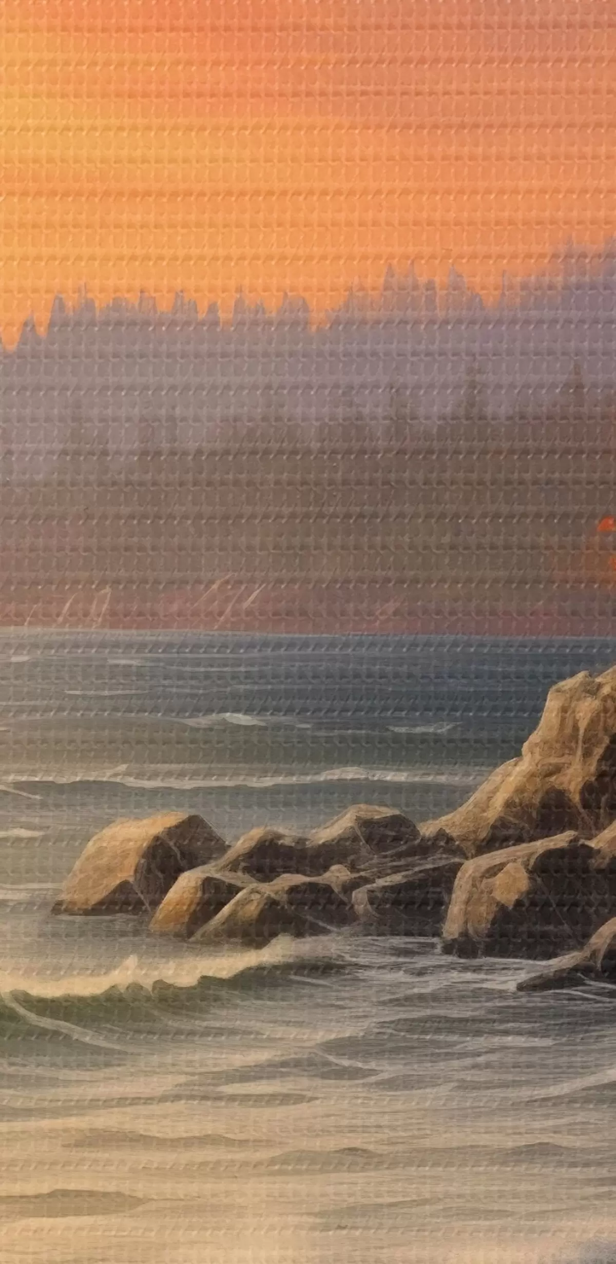 Tableau Un coucher de soleil sur le bord de mer avec des vagues, une forêt de pins et des couleurs d'automne au premier plan. Nr s42571