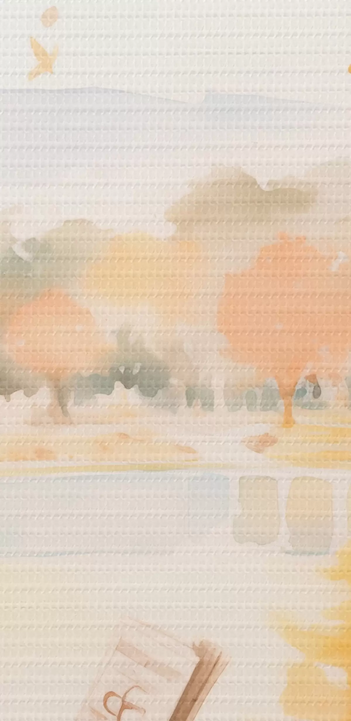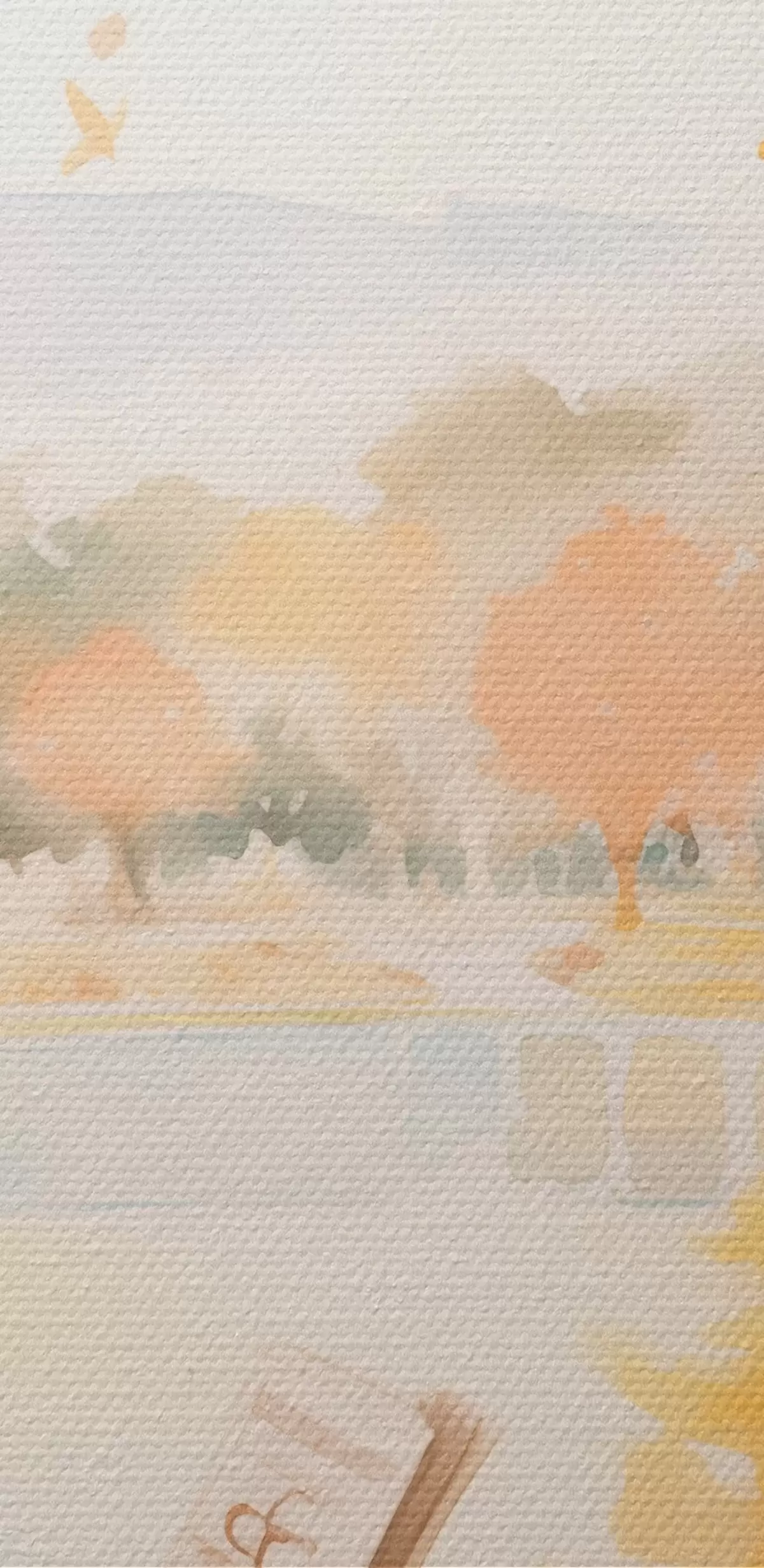 Tableau Une jeune fille lit un livre près d'une fenêtre ouverte dans un décor automnal, avec des arbres clairs en arrière-plan et une tasse de thé à proximité. Nr s42572