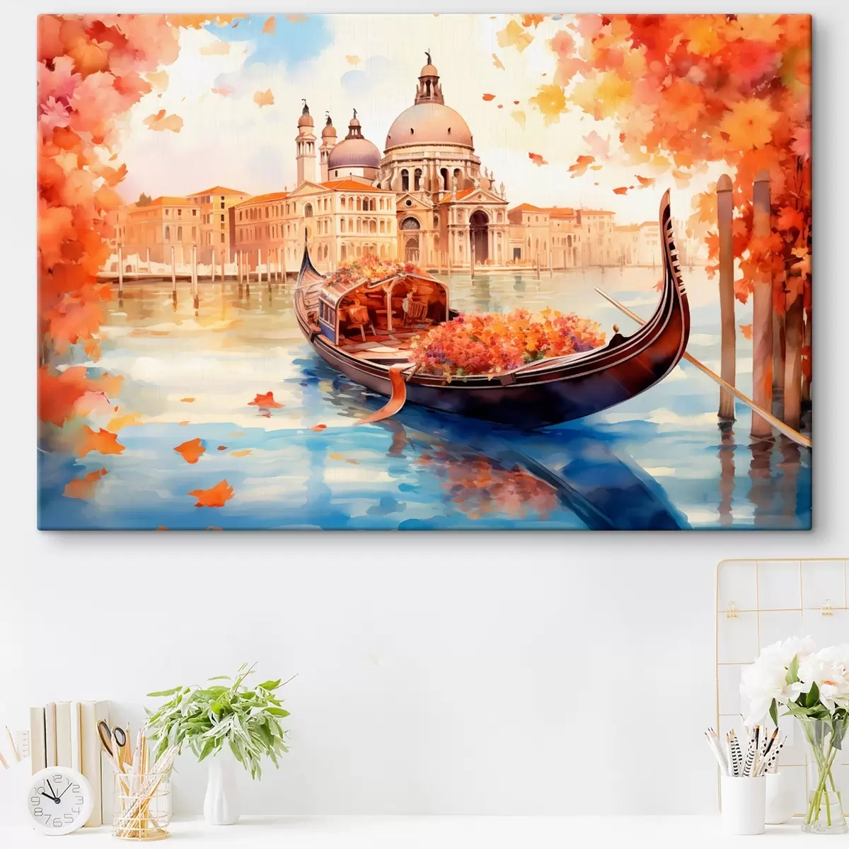 Tableau Vue automnale de Venise avec une gondole entourée de feuilles orange et rouge vif, avec les reflets des bâtiments dans l'eau calme du canal. s42576