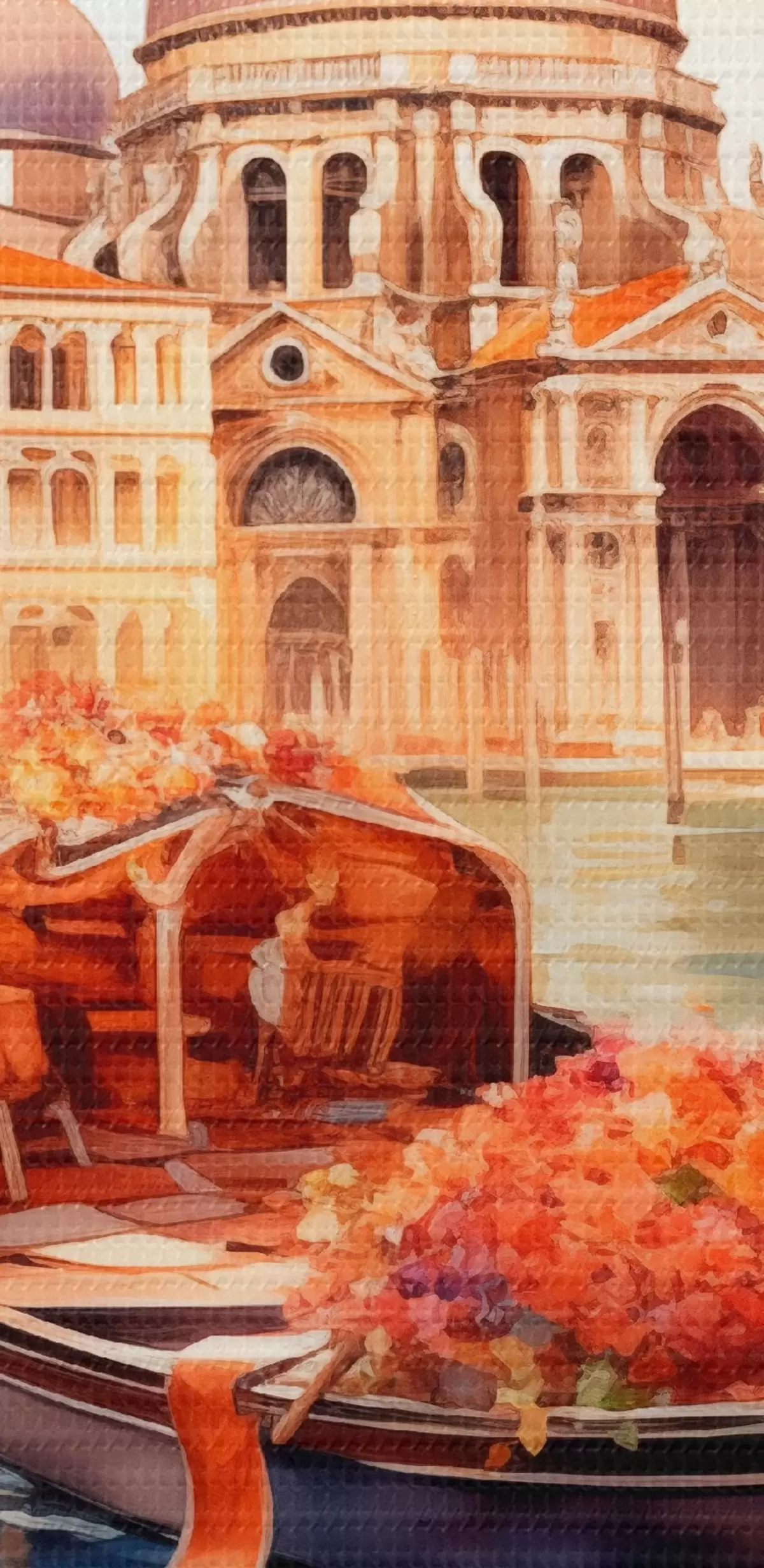 Tableau Vue automnale de Venise avec une gondole entourée de feuilles orange et rouge vif, avec les reflets des bâtiments dans l'eau calme du canal. Nr s42576