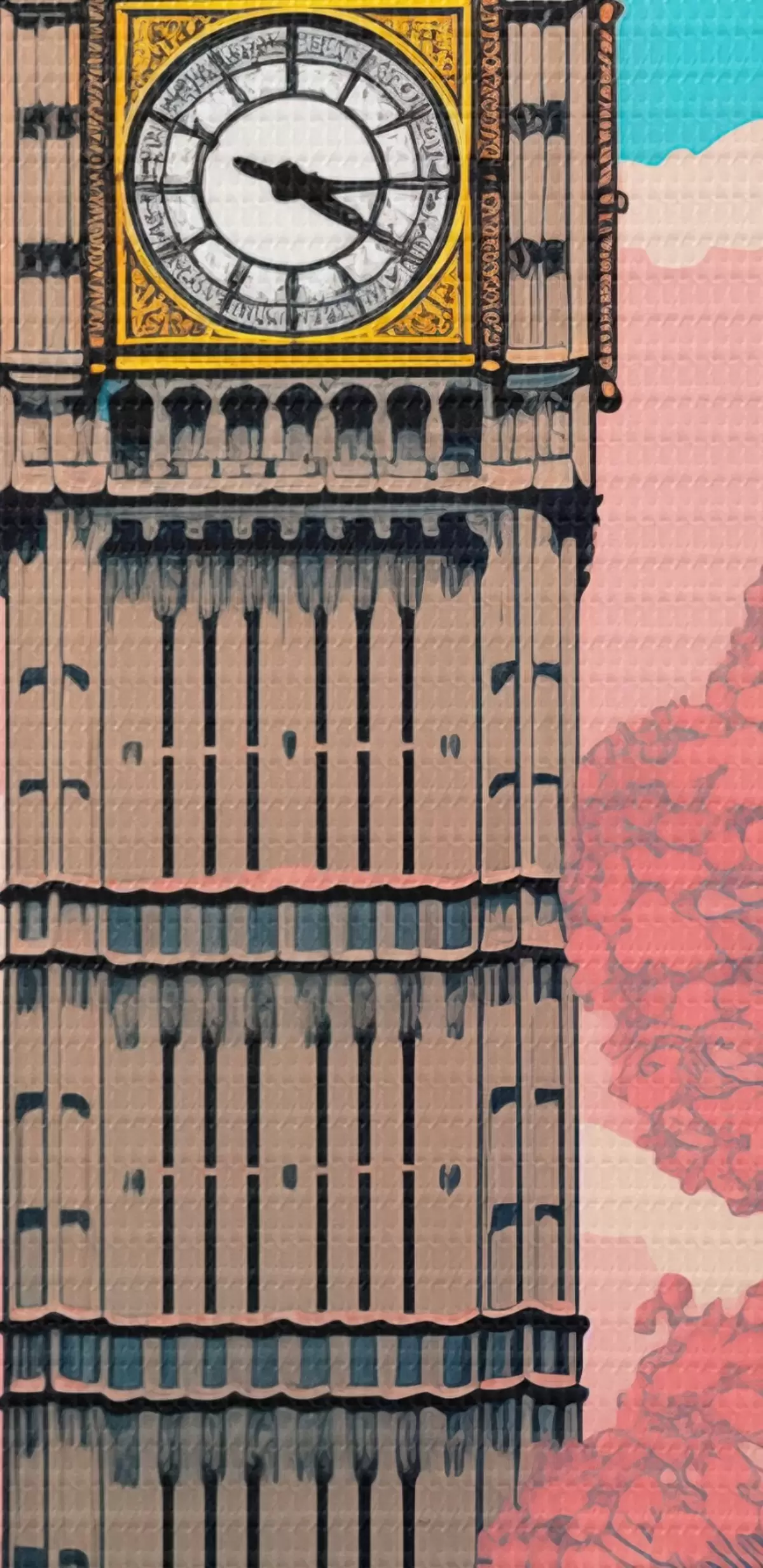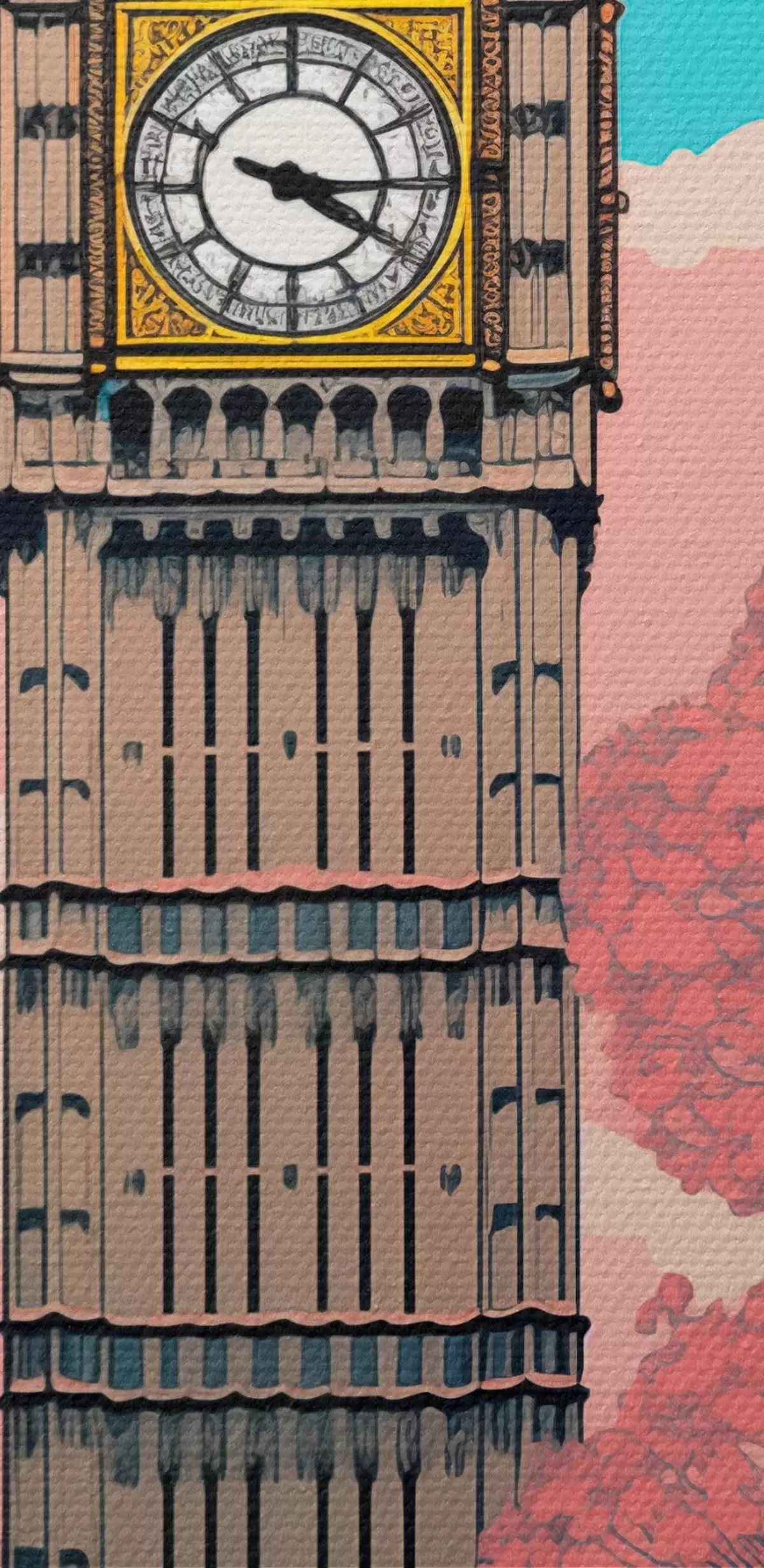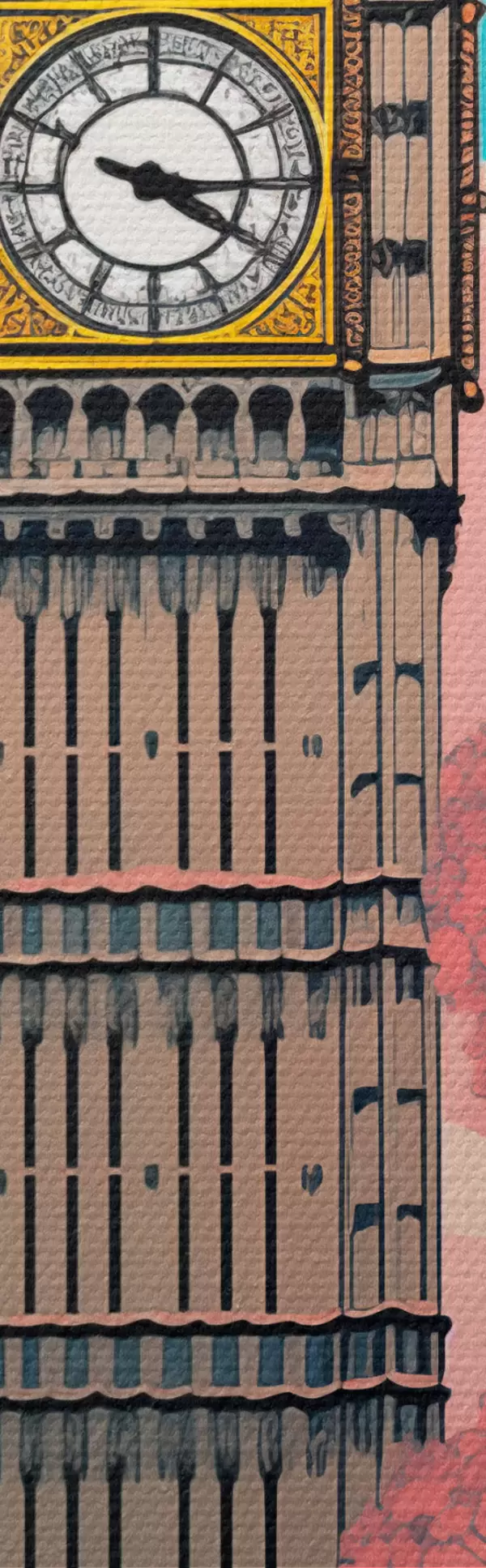 Tableau Une vue de Big Ben avec des arbres roses de printemps, un ciel bleu vif et un lampadaire vintage au premier plan. s42578