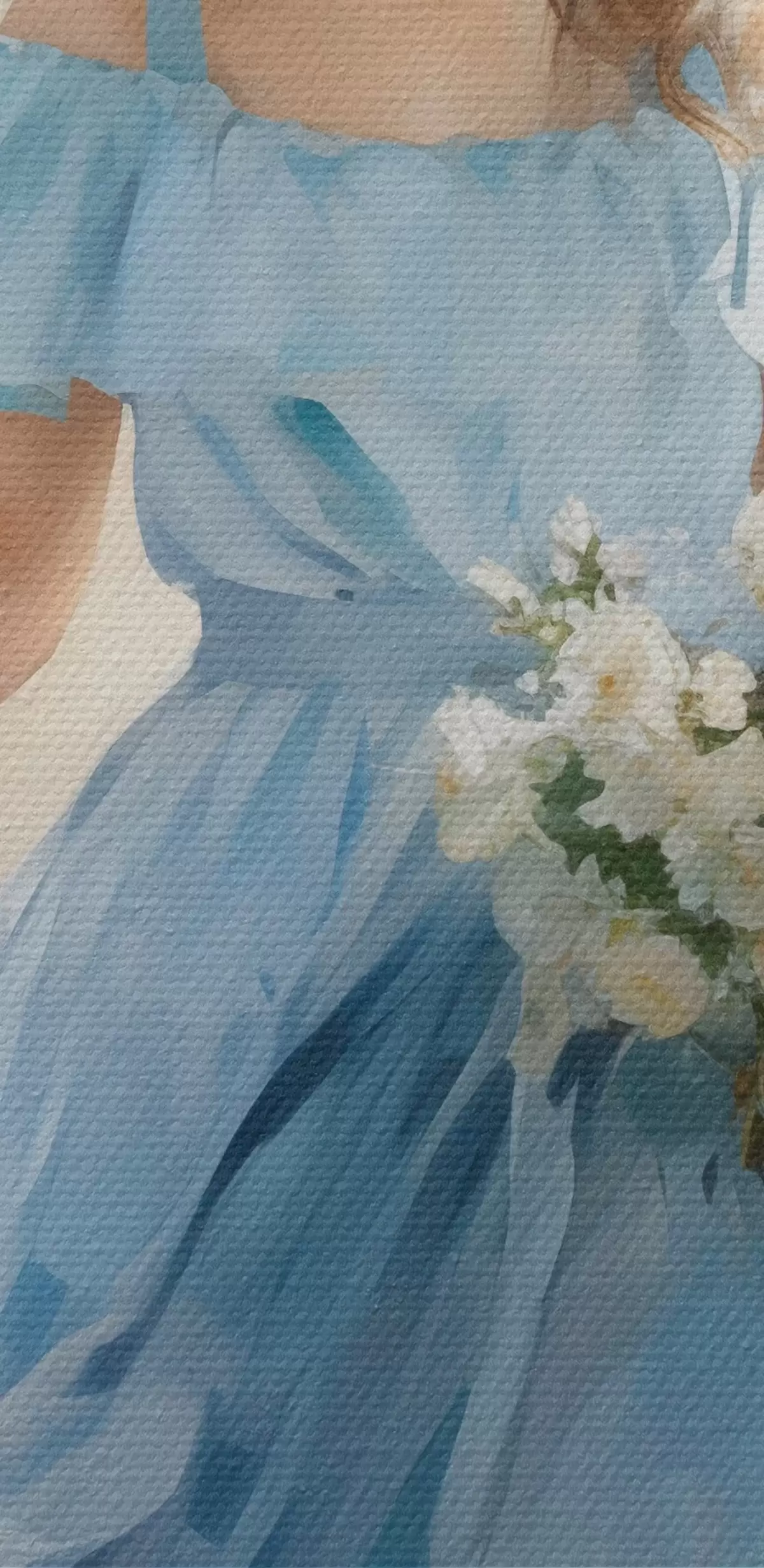 Tableau Une élégante jeune fille vêtue d'une robe bleu clair et d'un chapeau se promène dans la ville, un bouquet de fleurs à la main, dans une ambiance légère et romantique. Nr s42580