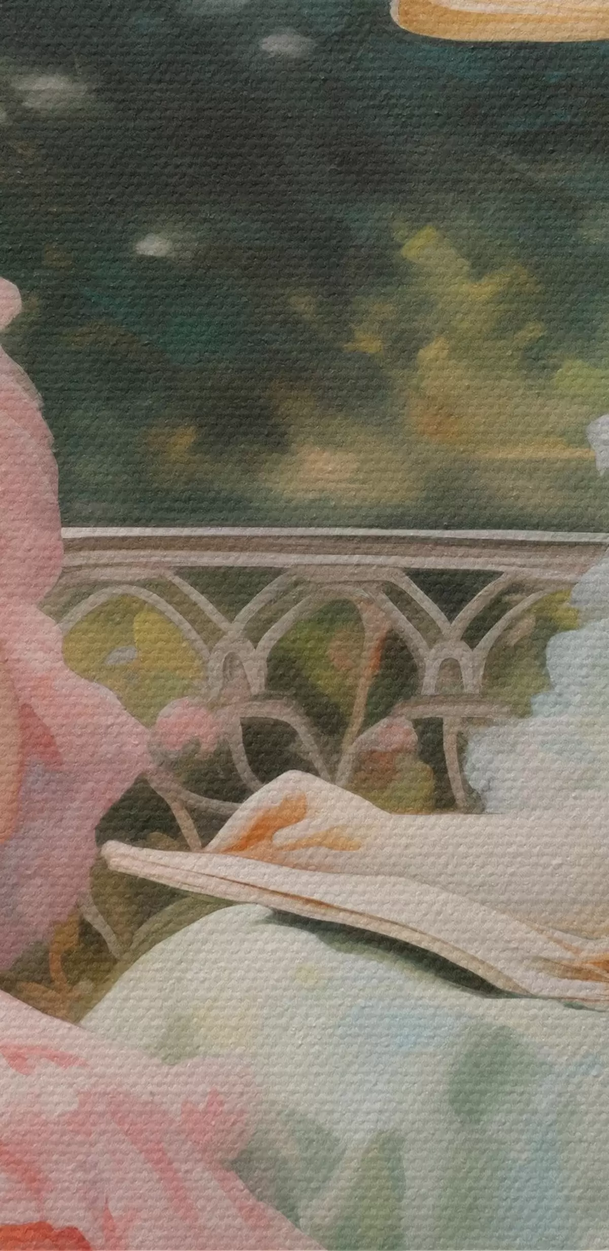 Tableau Deux élégantes femmes en robes pastel assises dans un jardin parmi des roses, lisant un livre et profitant d'une atmosphère paisible. s42582