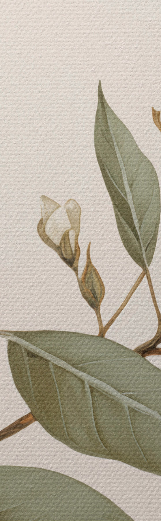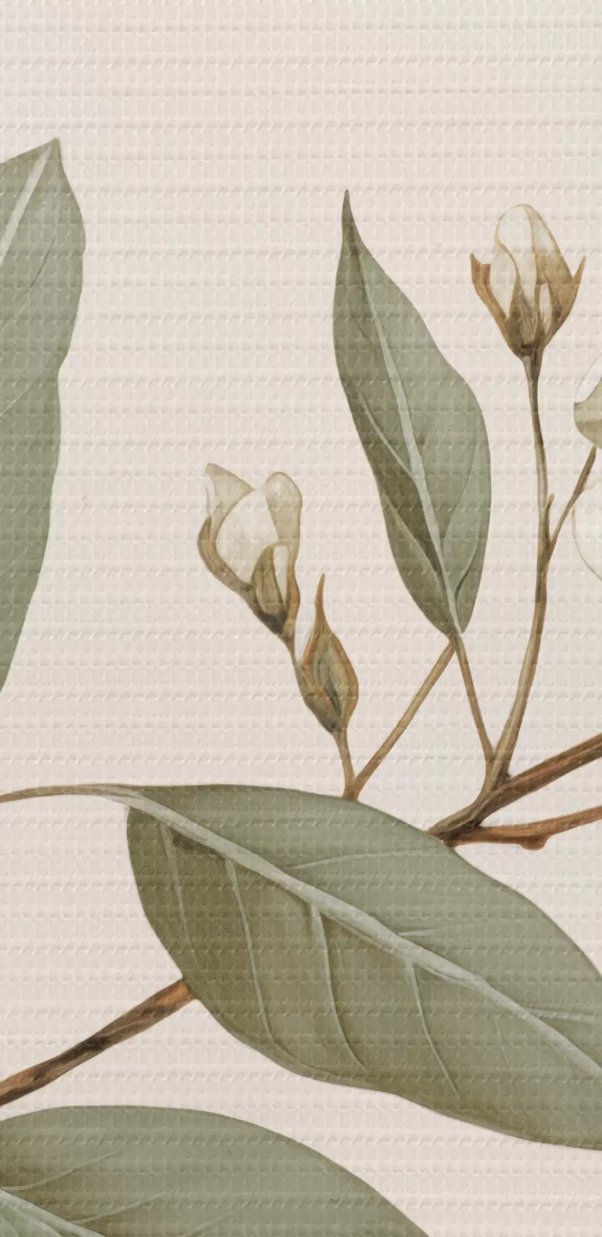 Tableau Une branche délicate avec des fleurs blanches et des feuilles vertes sur un fond clair, avec des détails doux et un style élégant. Nr s42583