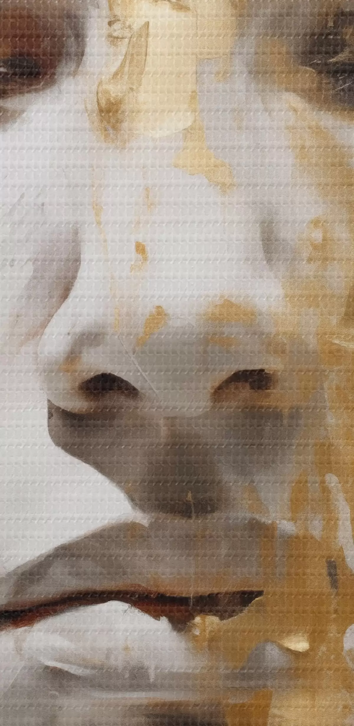 Tableau Un portrait abstrait aux yeux fermés, rendu dans des tons clairs avec des coups de pinceau contrastés aux couleurs chaudes qui créent une ambiance profonde et méditative. Nr s42624