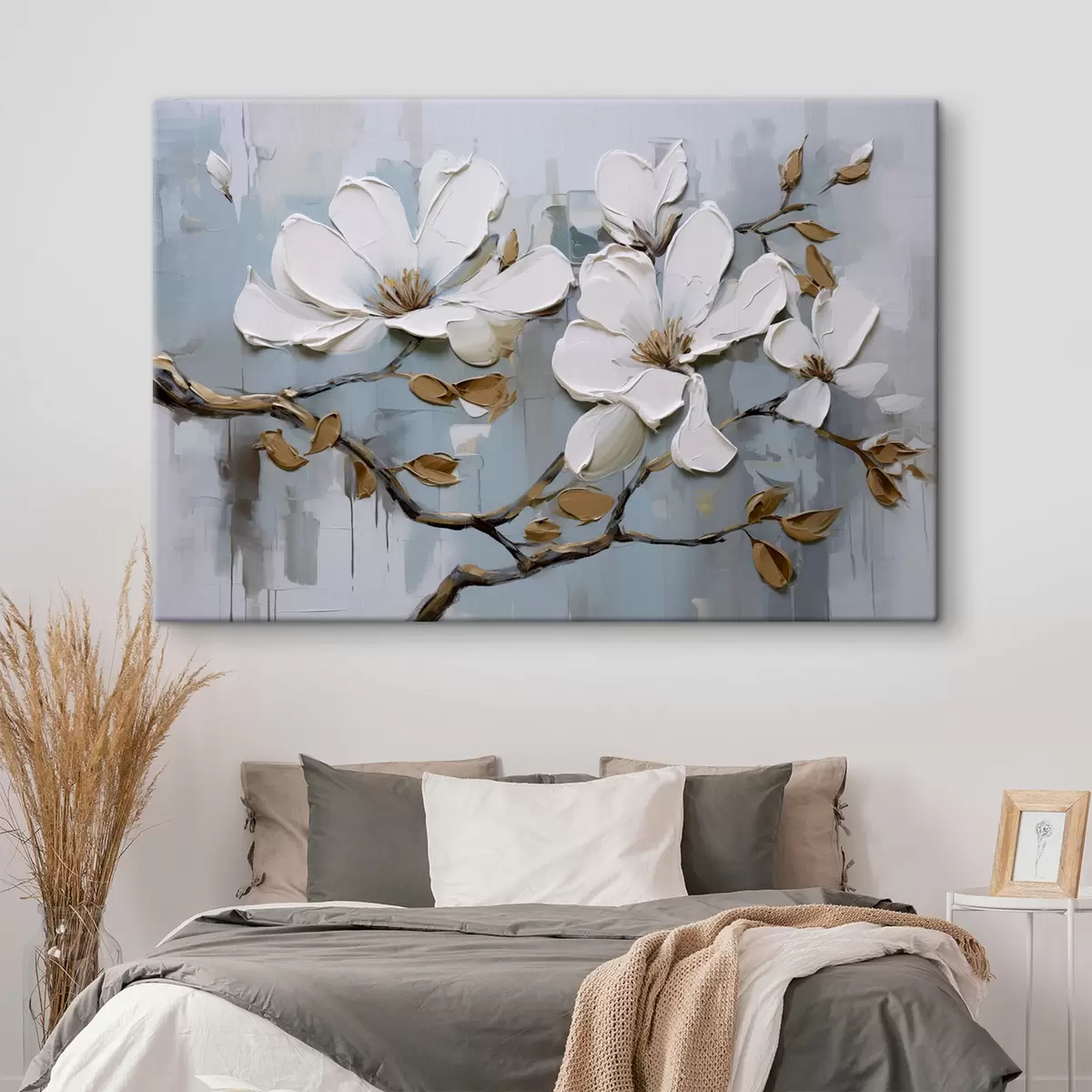 Tableau Fleurs de magnolia blanches avec pétales texturés et feuilles brunes sur fond bleu doux imitation peinture à l'huile s42711