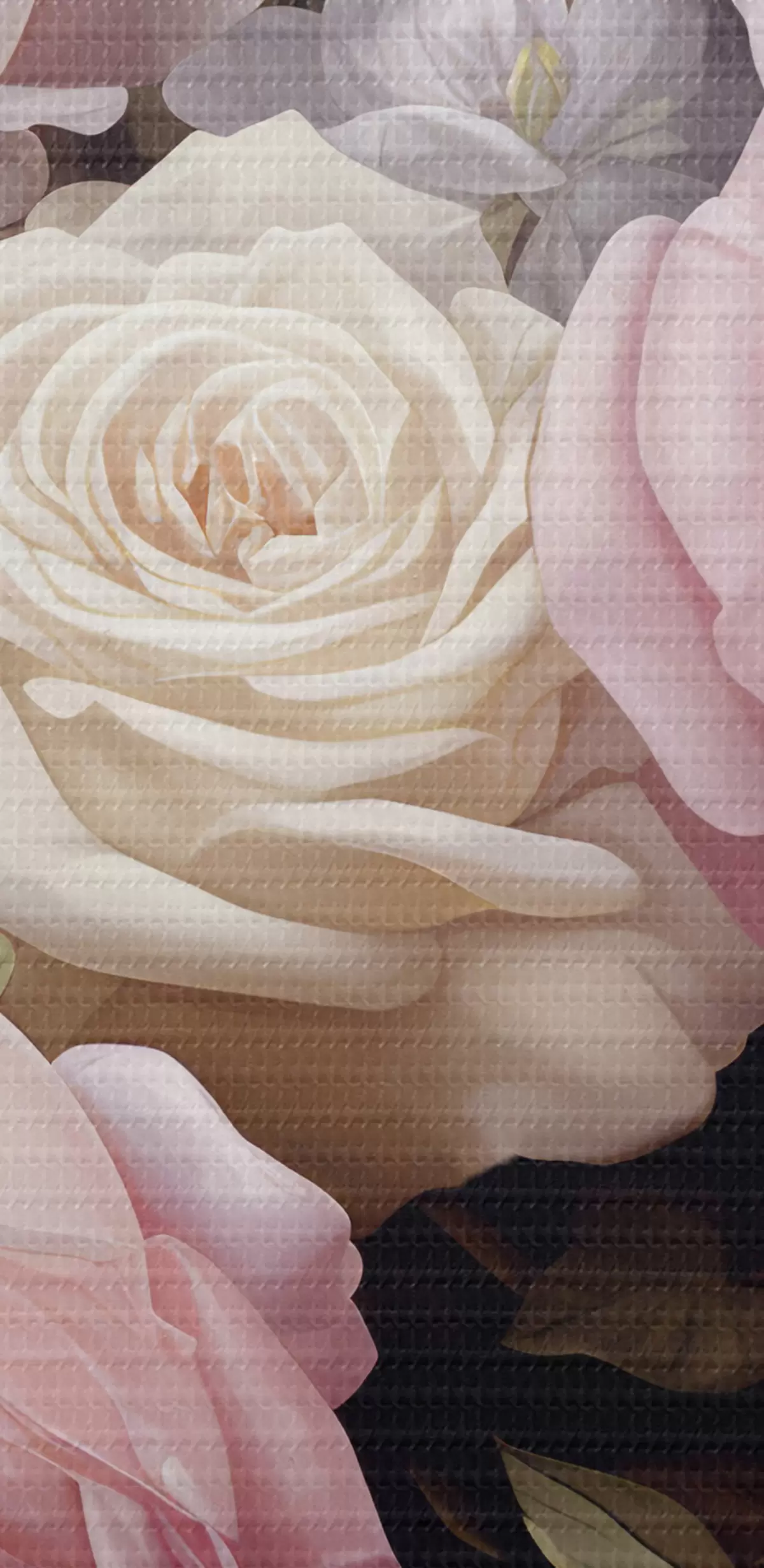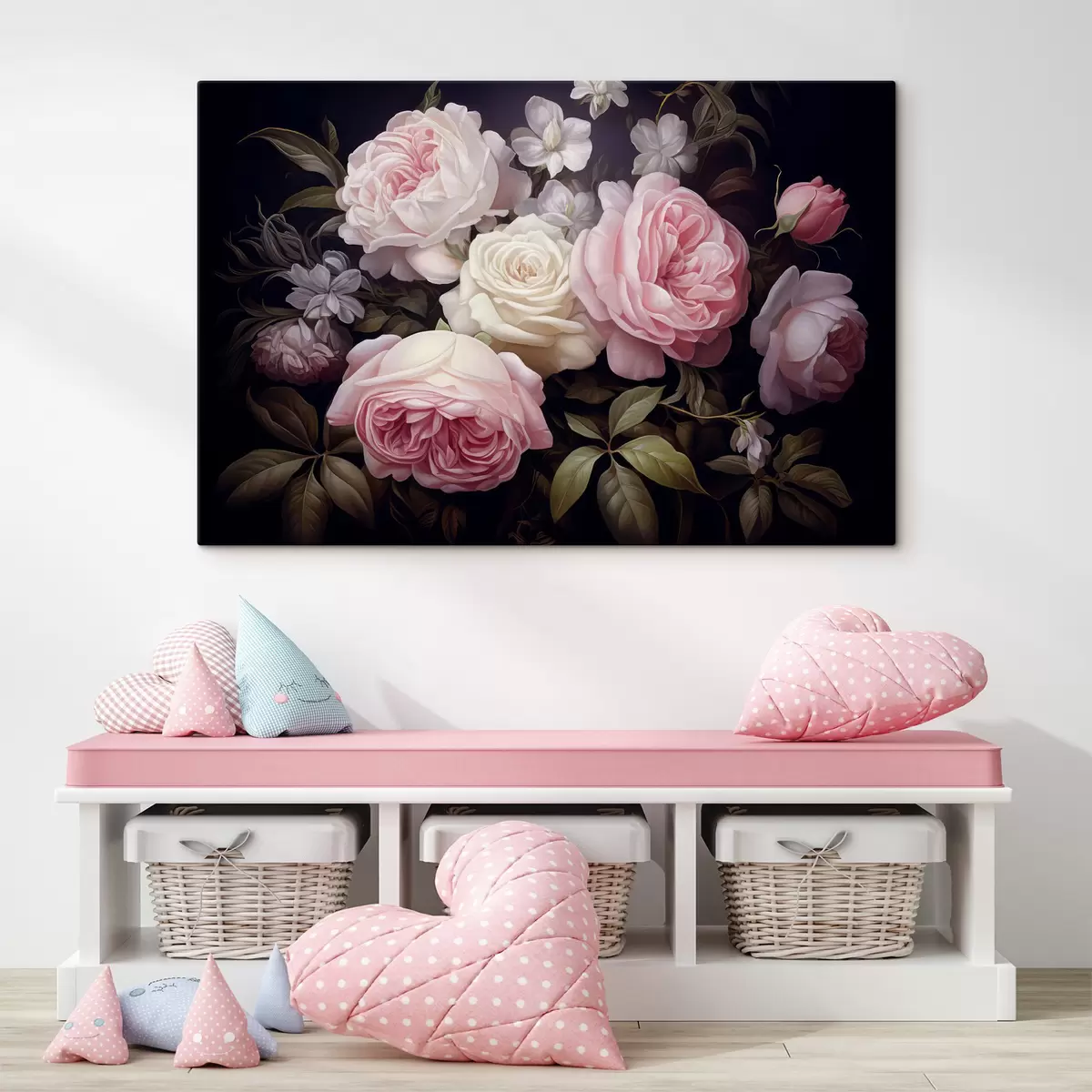 Tableau Roses roses et blanches arrangées avec des fleurs blanches délicates et des feuilles vertes sur un fond sombre s42721