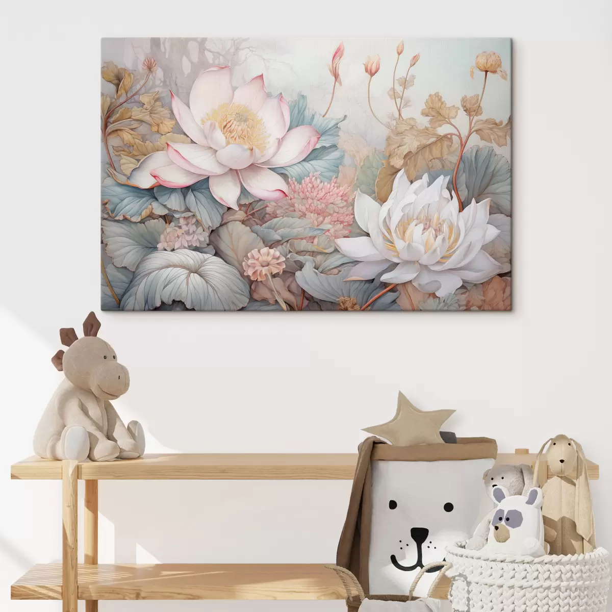 Tableau Grandes fleurs de lotus épanouies dans des tons doux de rose et de blanc, entourées de feuilles vertes et d'un délicat feuillage rose Nr s42729