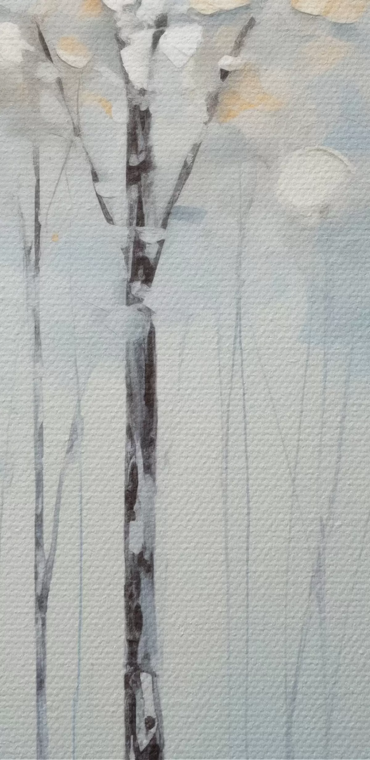 Tableau Grands arbres élancés avec des feuilles bleues et des touches de jaune sur un fond bleu tendre, imitation peinture à l'huile s42731