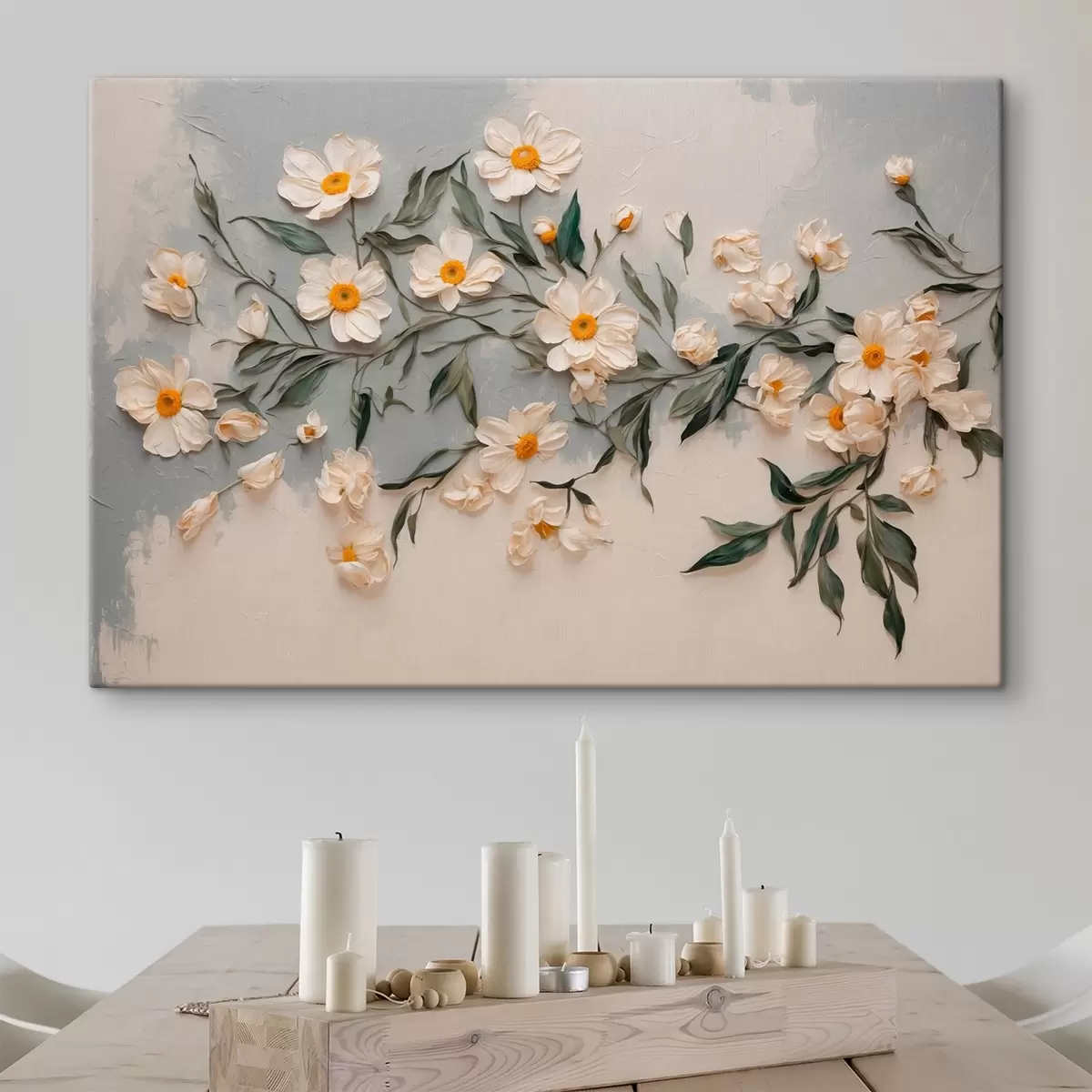Tableau Fleurs et feuilles blanches sur fond blanc et gris s42764