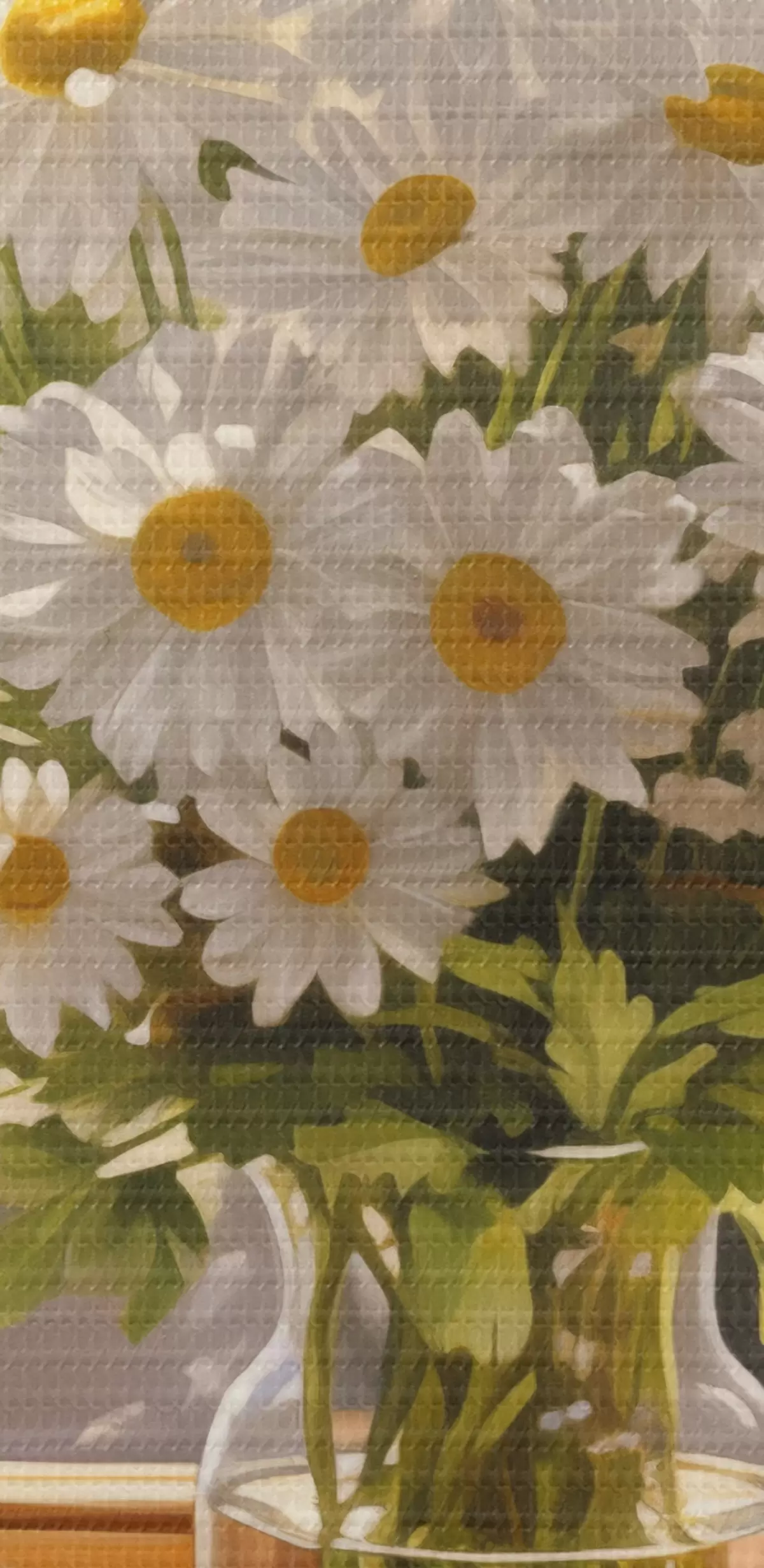 Tableau Peinture à l'huile imitant un vase avec des marguerites blanches sur un rebord de fenêtre, journée ensoleillée, palette de couleurs chaudes s43171