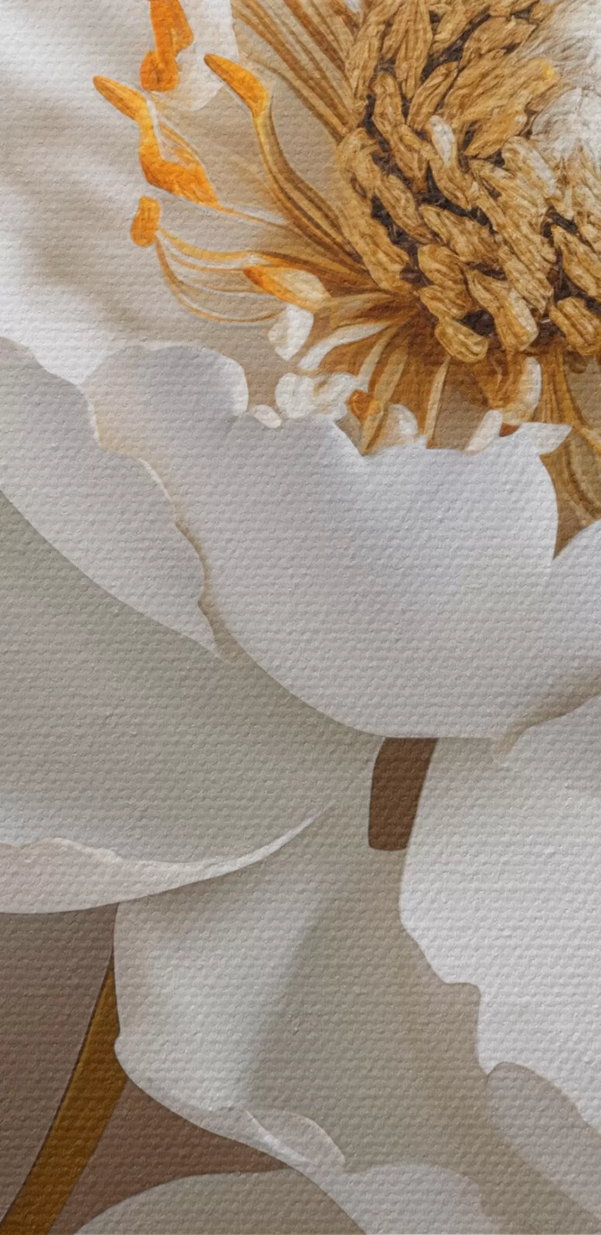 Tableau Fleurs de pivoine blanches, délicates et détaillées, avec des feuilles jaunes, sur fond gris clair s43176