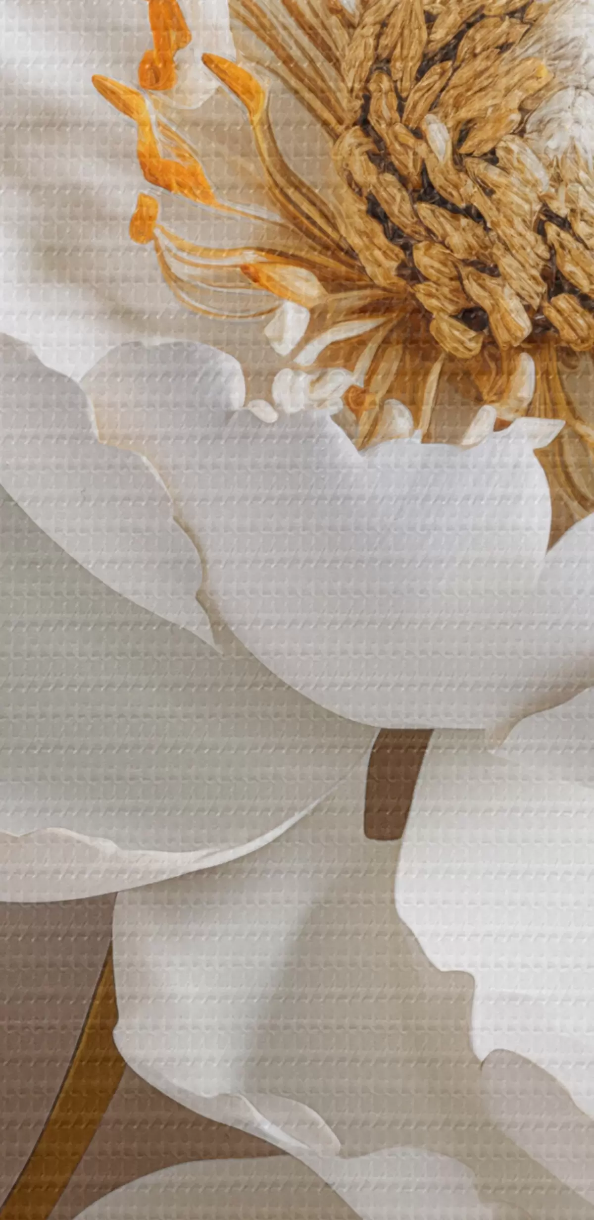 Tableau Fleurs de pivoine blanches, délicates et détaillées, avec des feuilles jaunes, sur fond gris clair Nr s43176