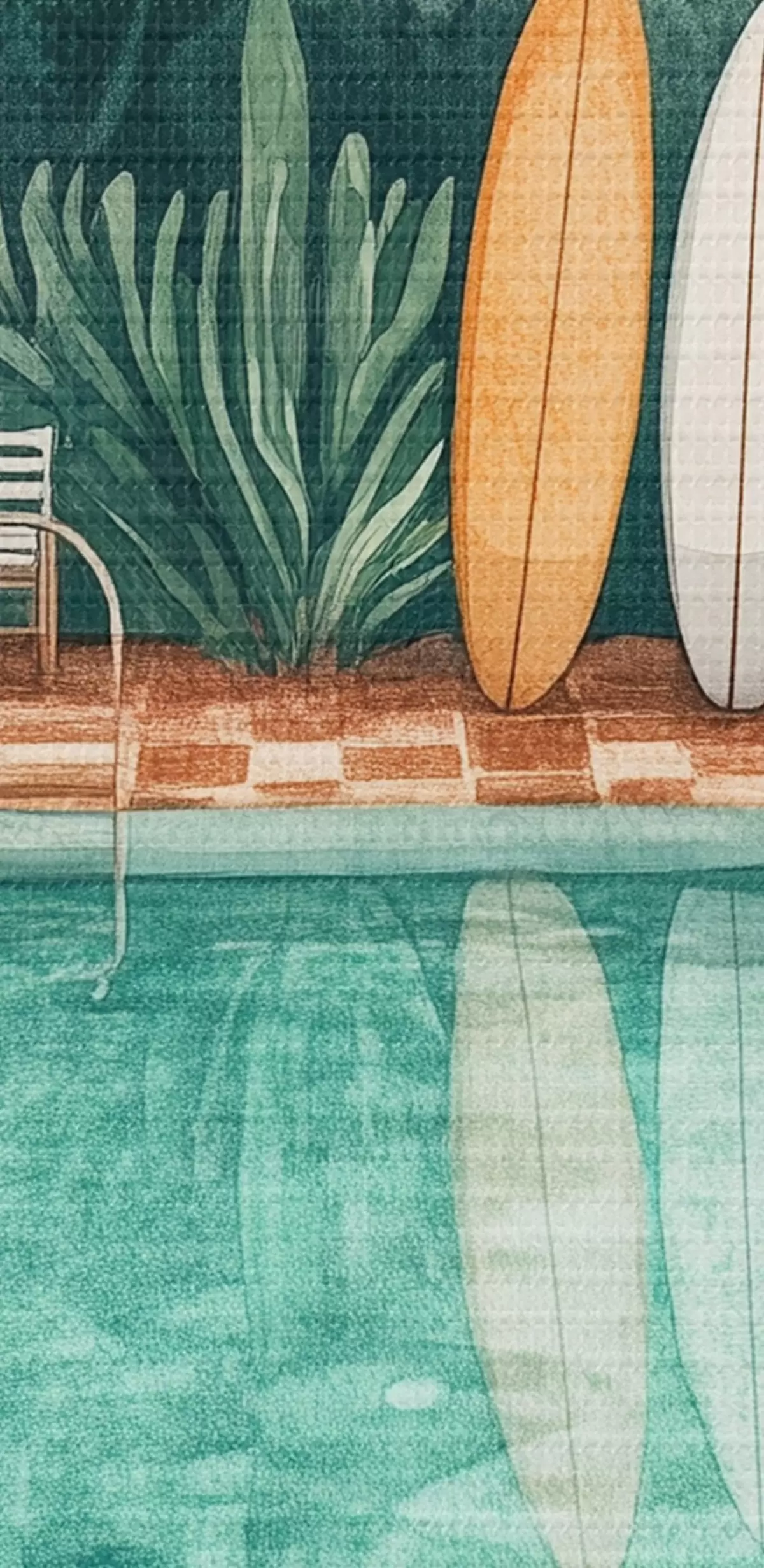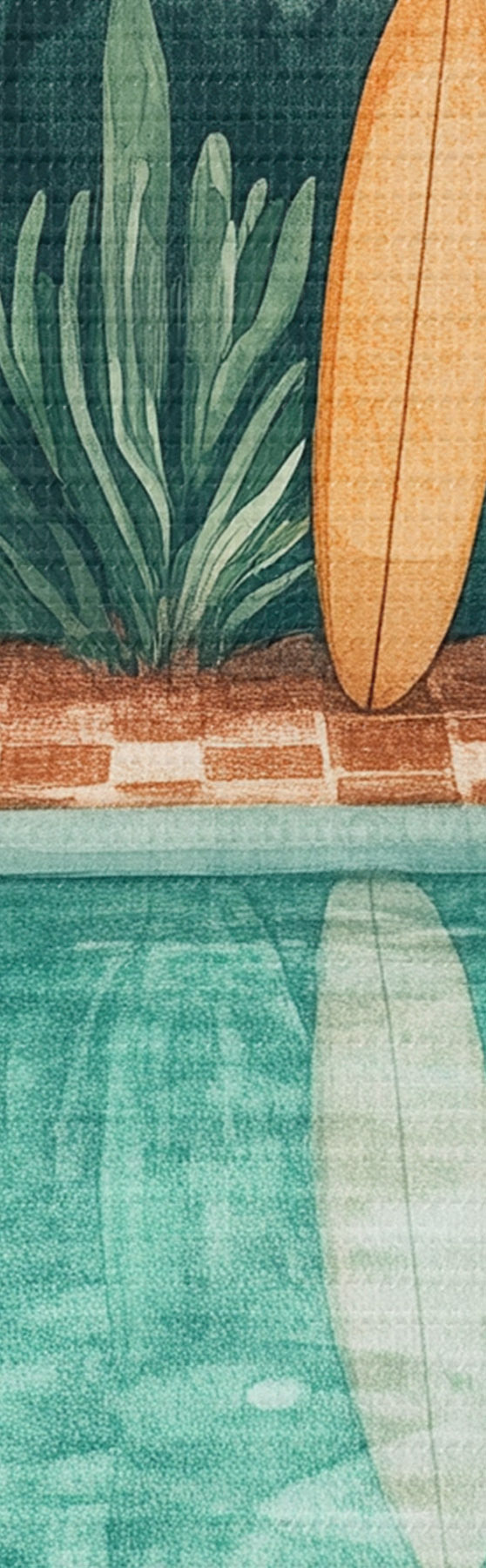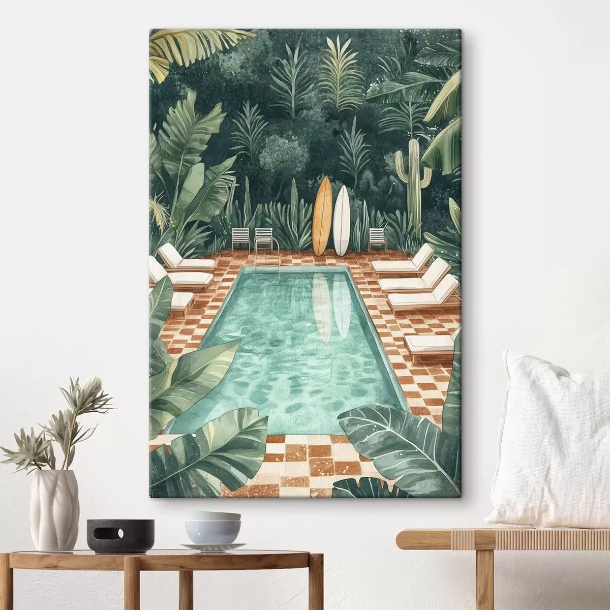 Tableau Piscine d'été vintage, forêt tropicale, verdure, palmiers, style aquarelle s43191