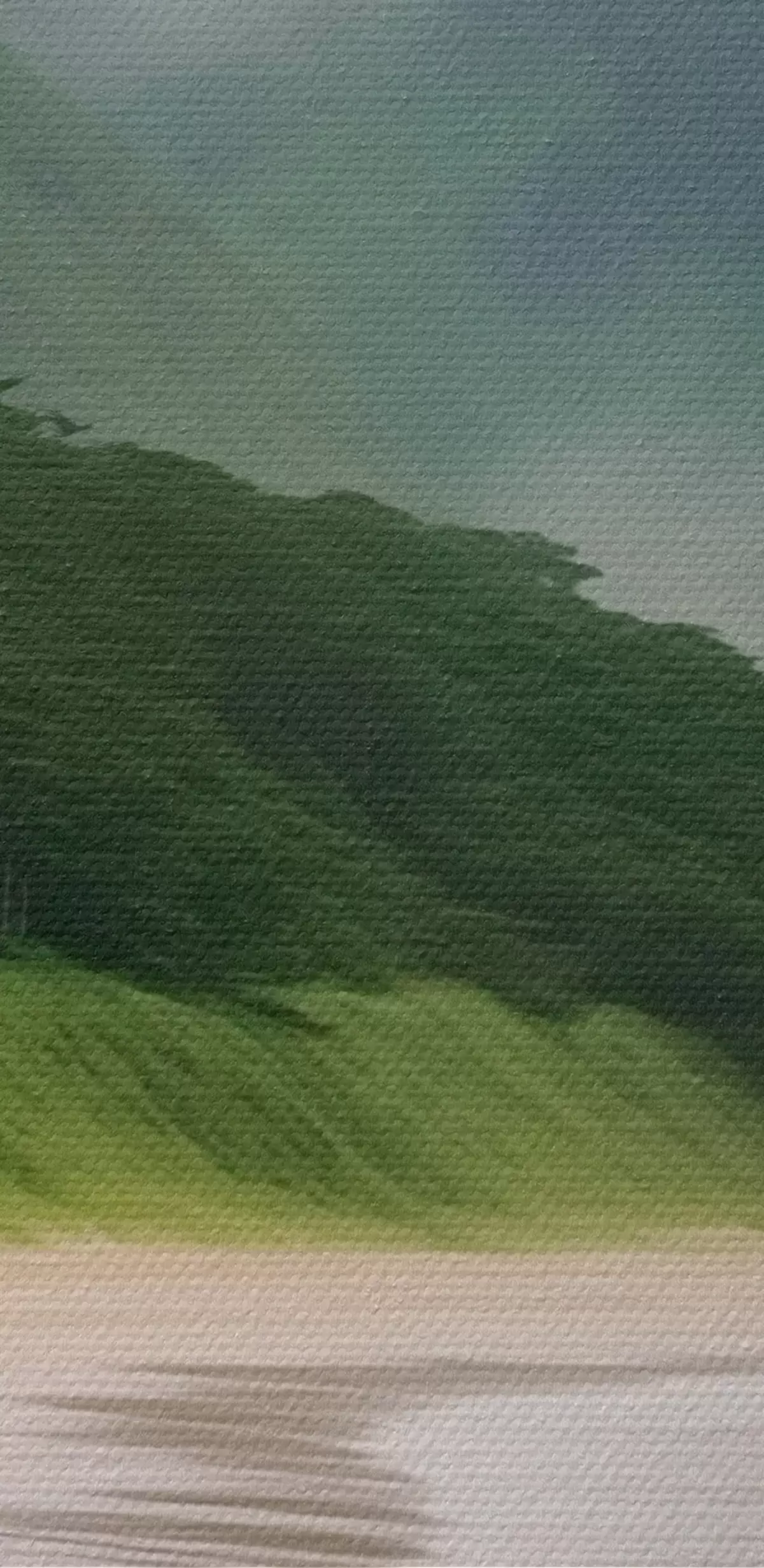 Tableau Plage brumeuse près de pentes vertes Nr s43271