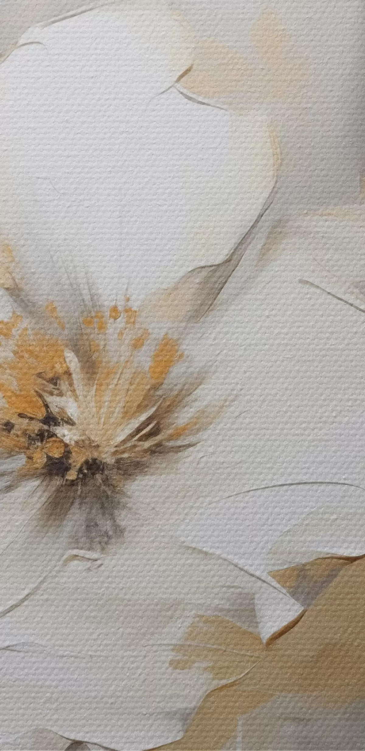 Tableau Fleurs blanches avec feuilles jaunes sur fond blanc, imitation de coups de pinceau épais, style moderne texturé s43389