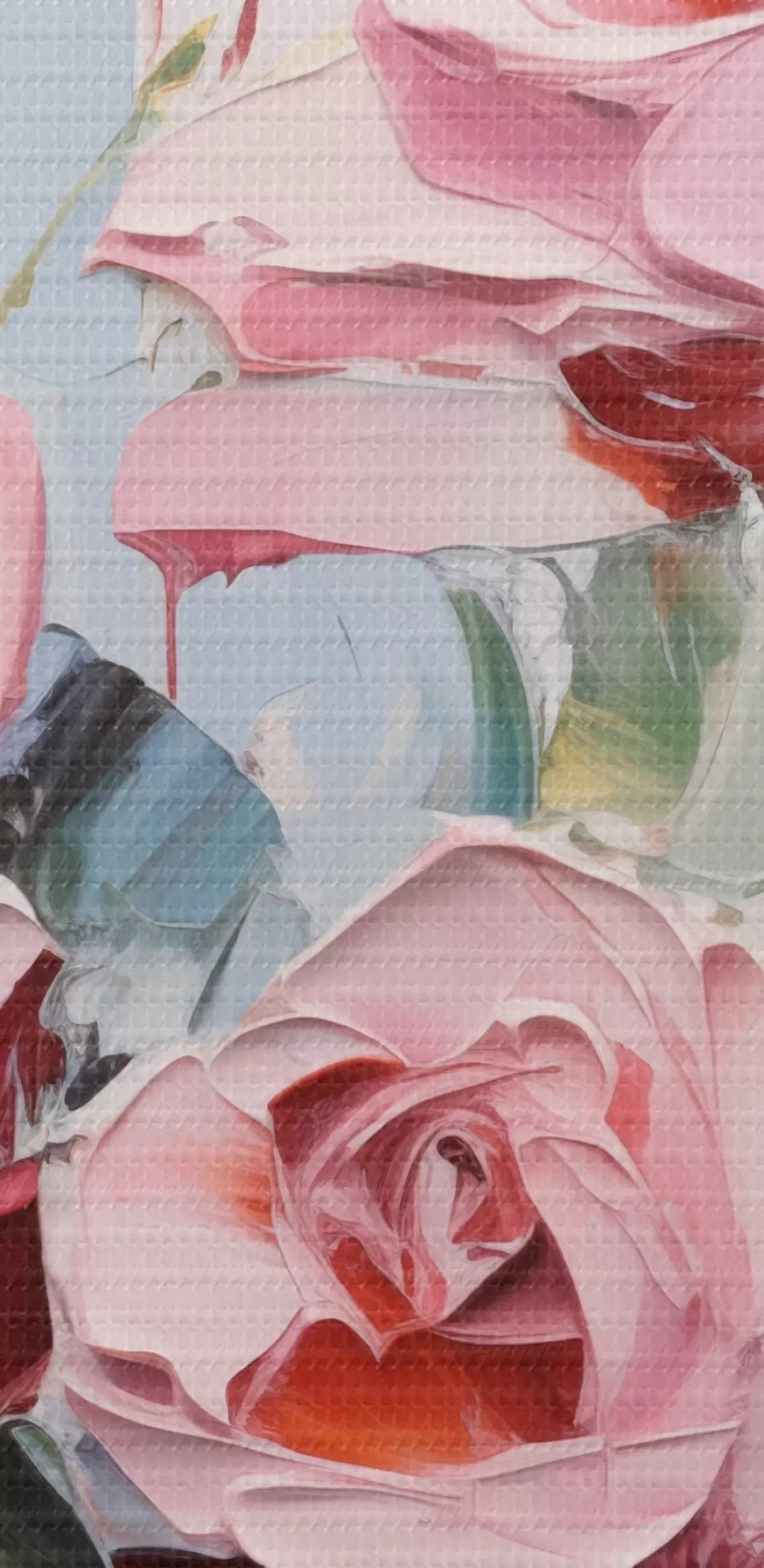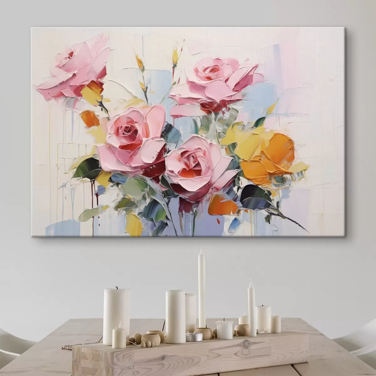 Tableau Art abstrait moderne de roses roses et jaunes avec des feuilles, coups de pinceau épais, imitation de peinture à l'huile, couleurs pastel s43392