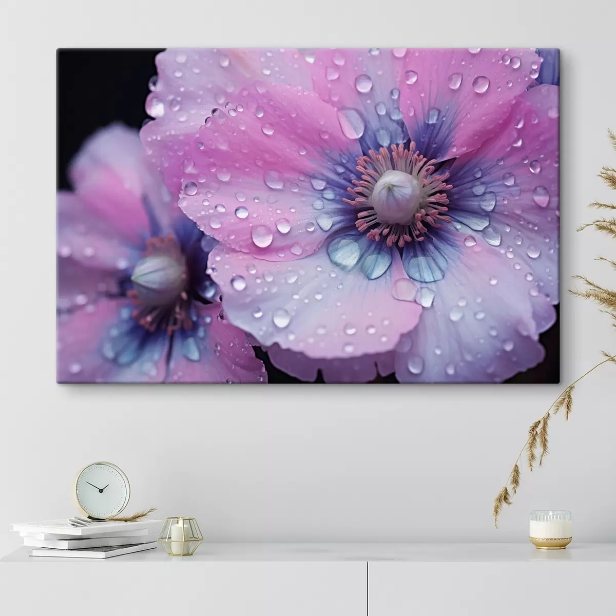 Tableau Fleurs roses et violettes en pleine floraison couvertes de gouttelettes d'eau, sur fond sombre s43394