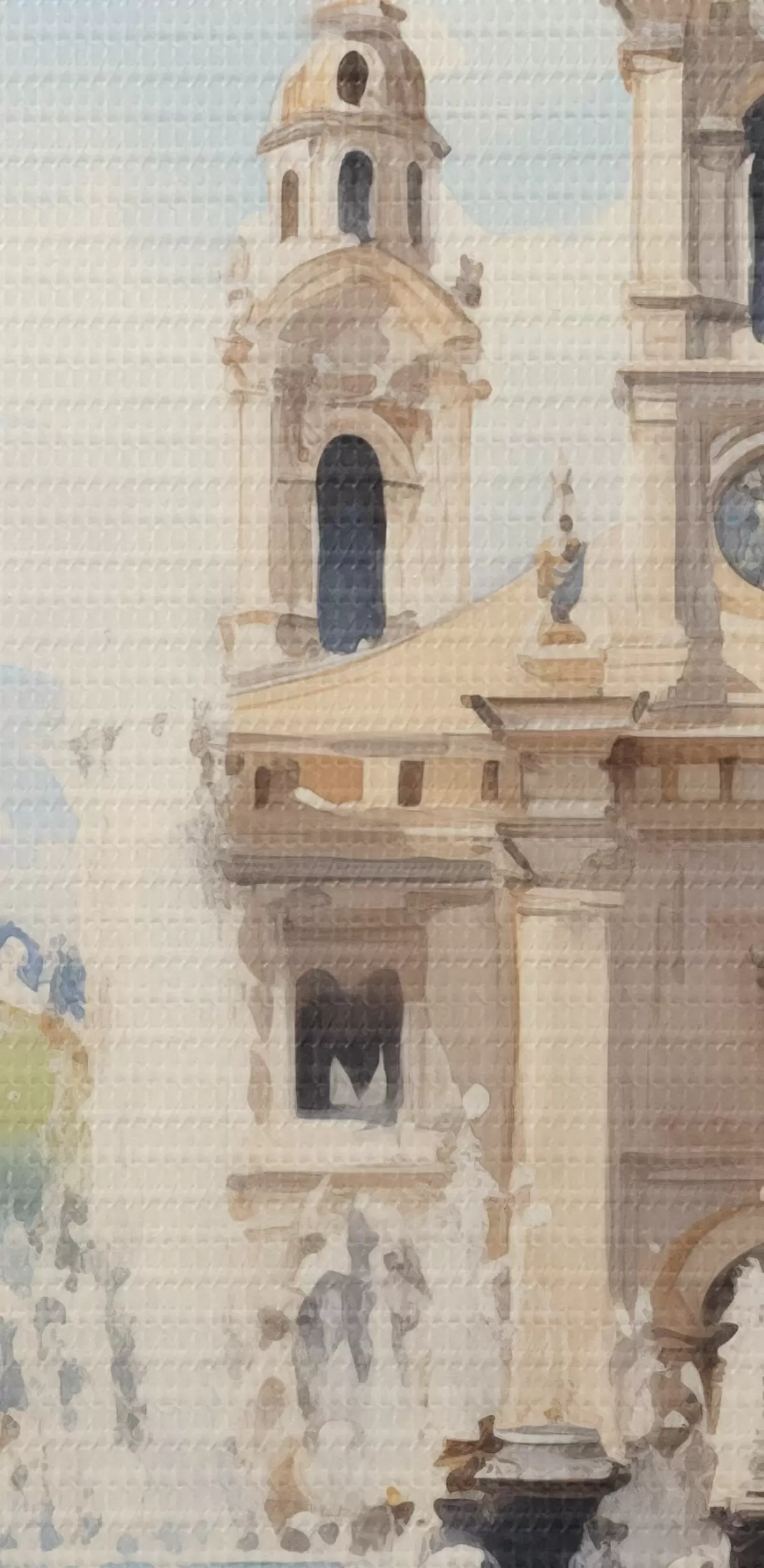 Tableau Paysage urbain abstrait avec une tour et une fontaine sur une place de la ville, montagnes au loin, style aquarelle Nr s43397