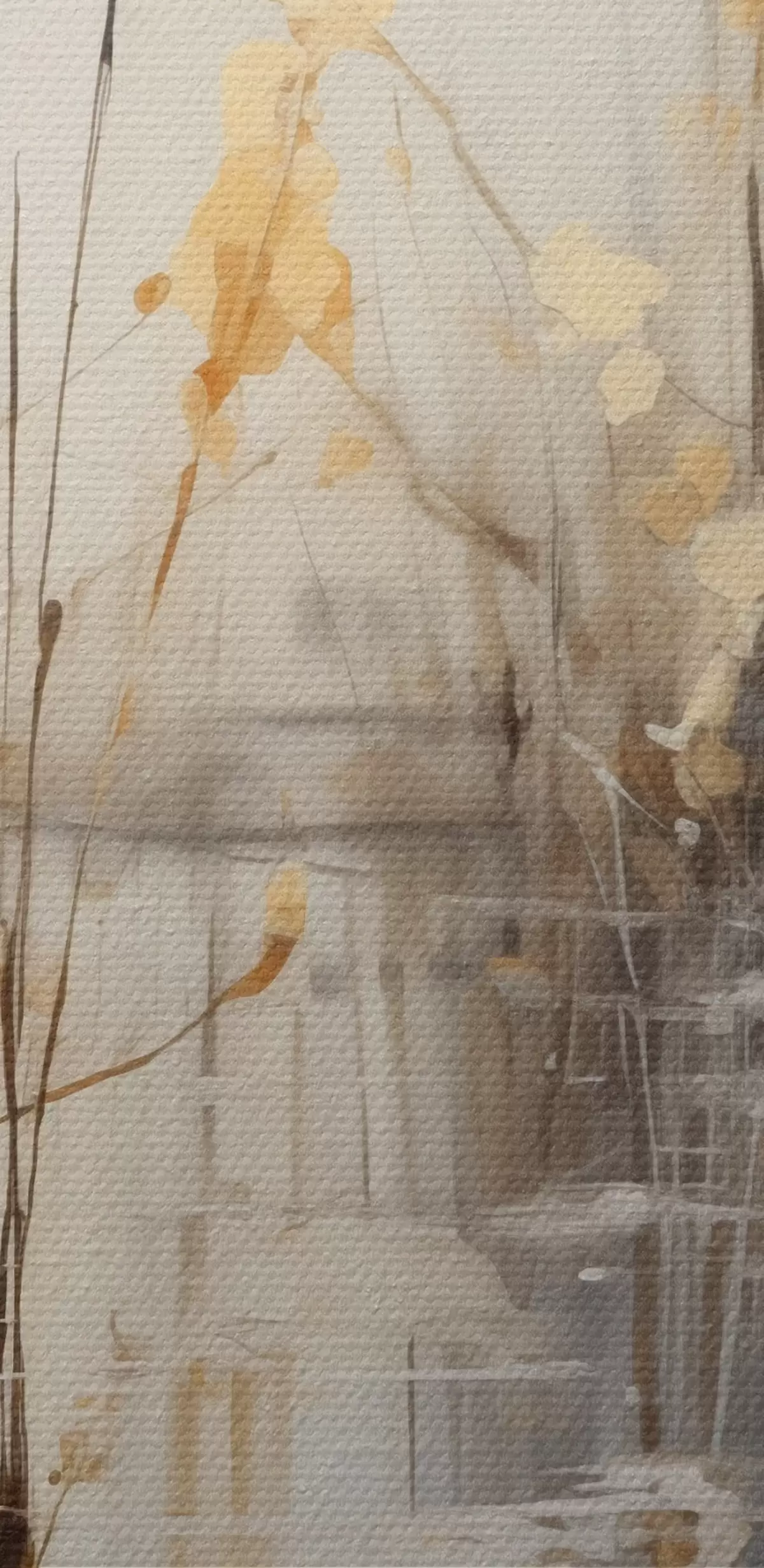 Tableau Un héron gris se tenant dans un étang, entouré de plantes hautes et fines, l'arrière-plan est un doux mélange de beige et de blanc s43398