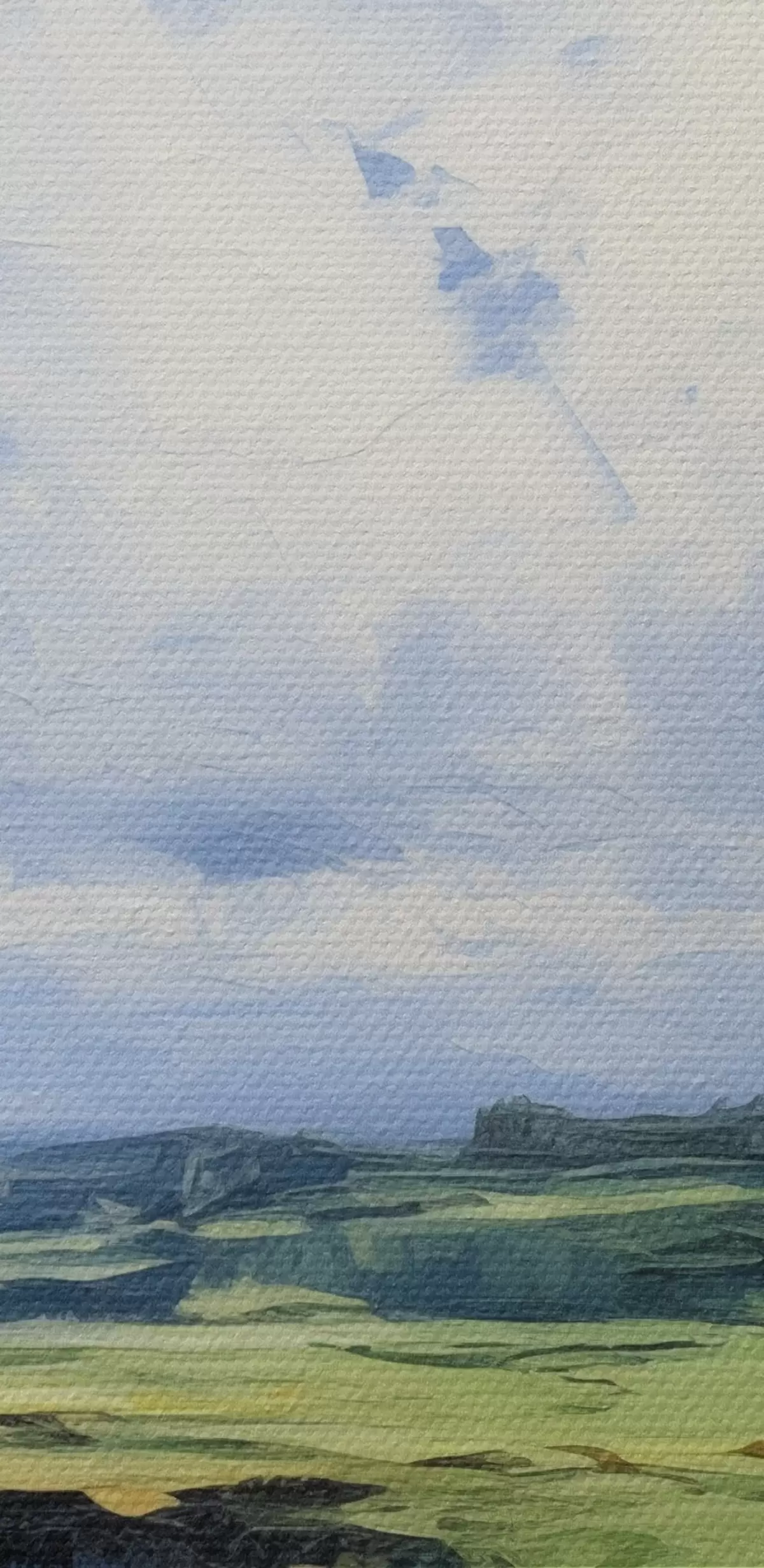 Tableau Champ vert avec une falaise sur la côte, mer bleue avec des vagues, ciel nuageux, peinture à l'huile minimaliste moderne imitation Nr s43406