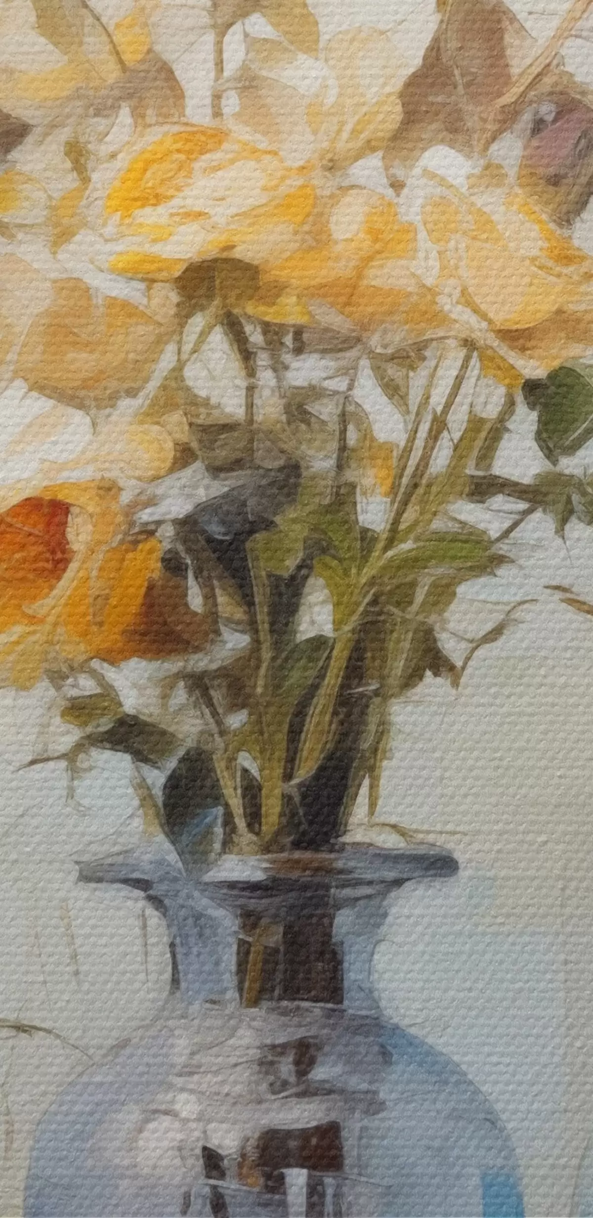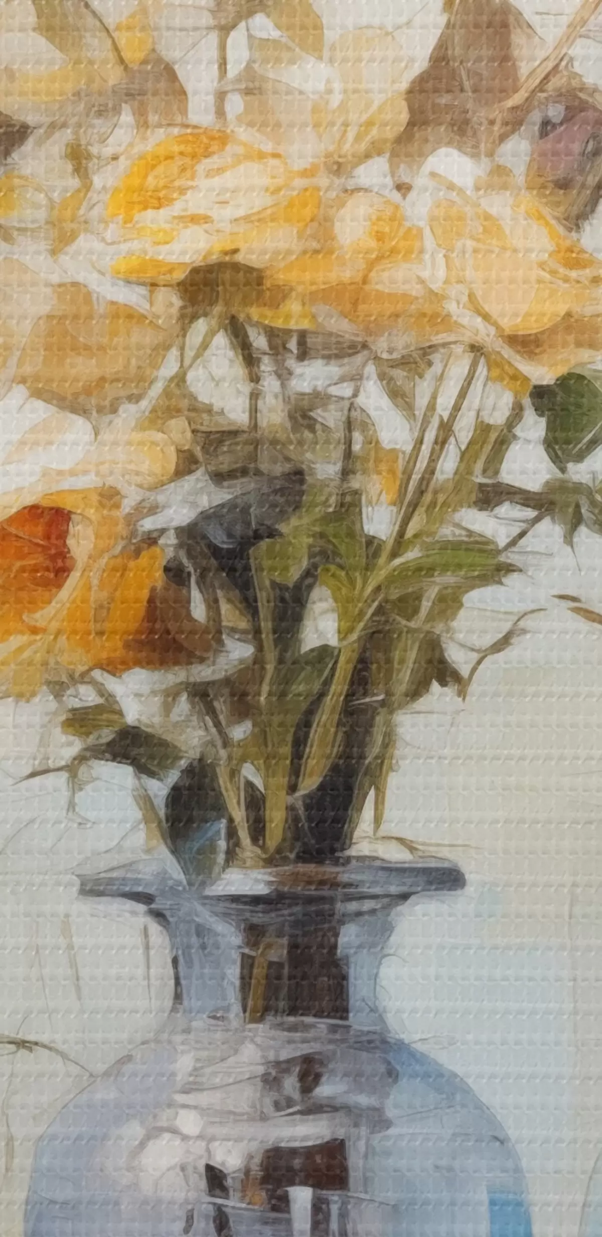 Tableau Nature morte de roses jaunes dans des vases en verre bleu, fond légèrement texturé, coups de pinceau doux, style peinture à l'huile Nr s43409