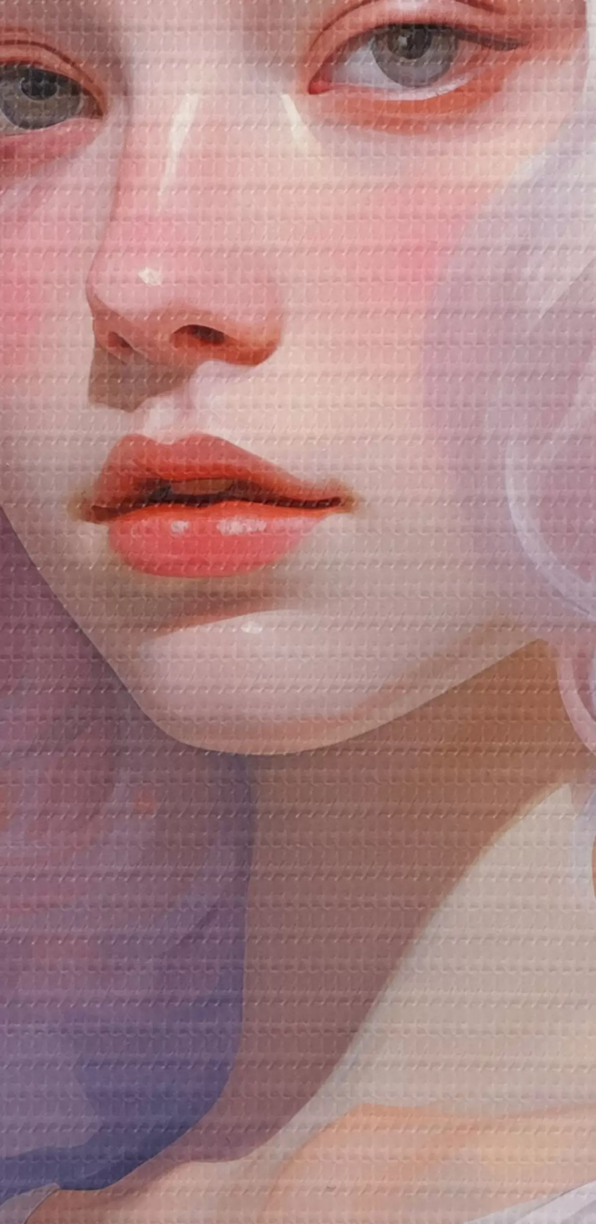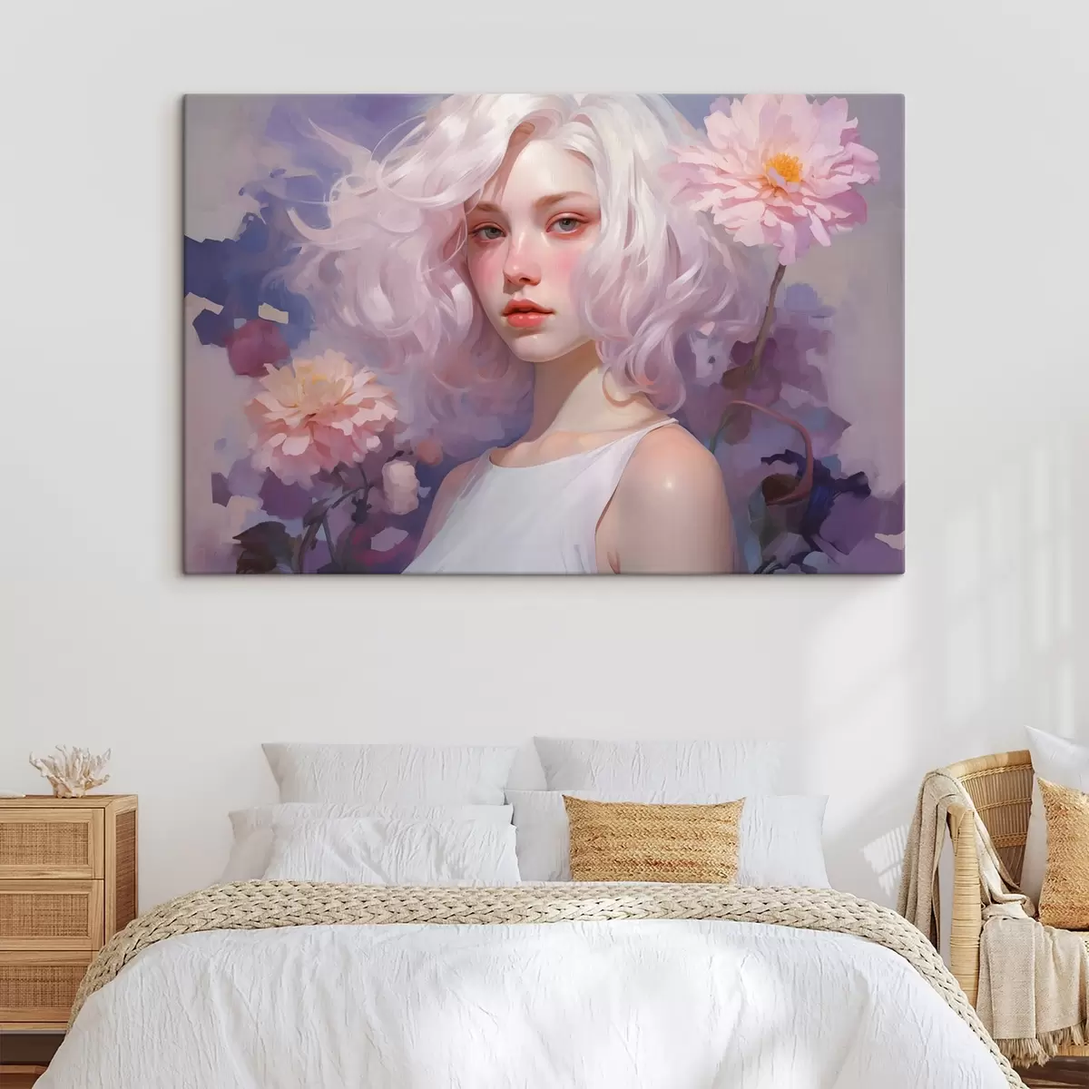 Tableau Belle fille dans les fleurs, dessin acrylique, Japon, couleurs violettes s43495