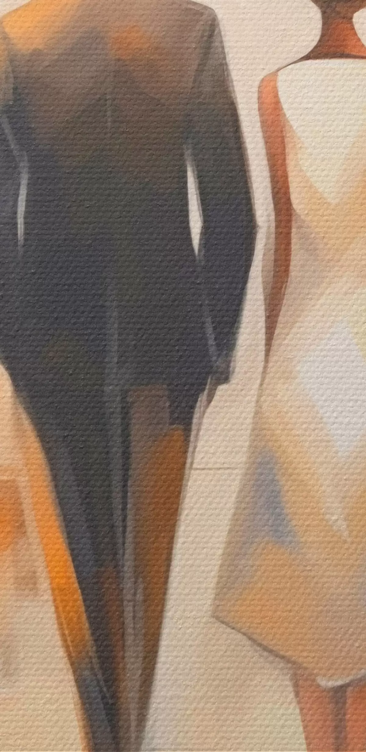 Tableau Abstraction avec des silhouettes de villes et deux personnages s43516