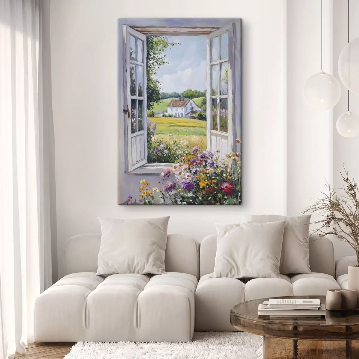 Tableau Paysages de village dans la fenêtre en bois, fleurs, champs, style huile, maison de ferme s43888