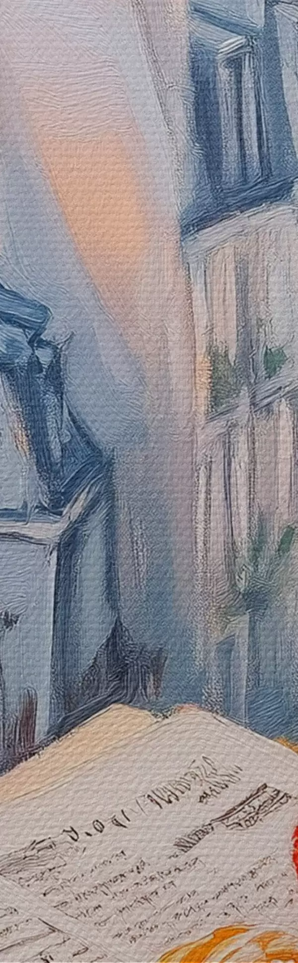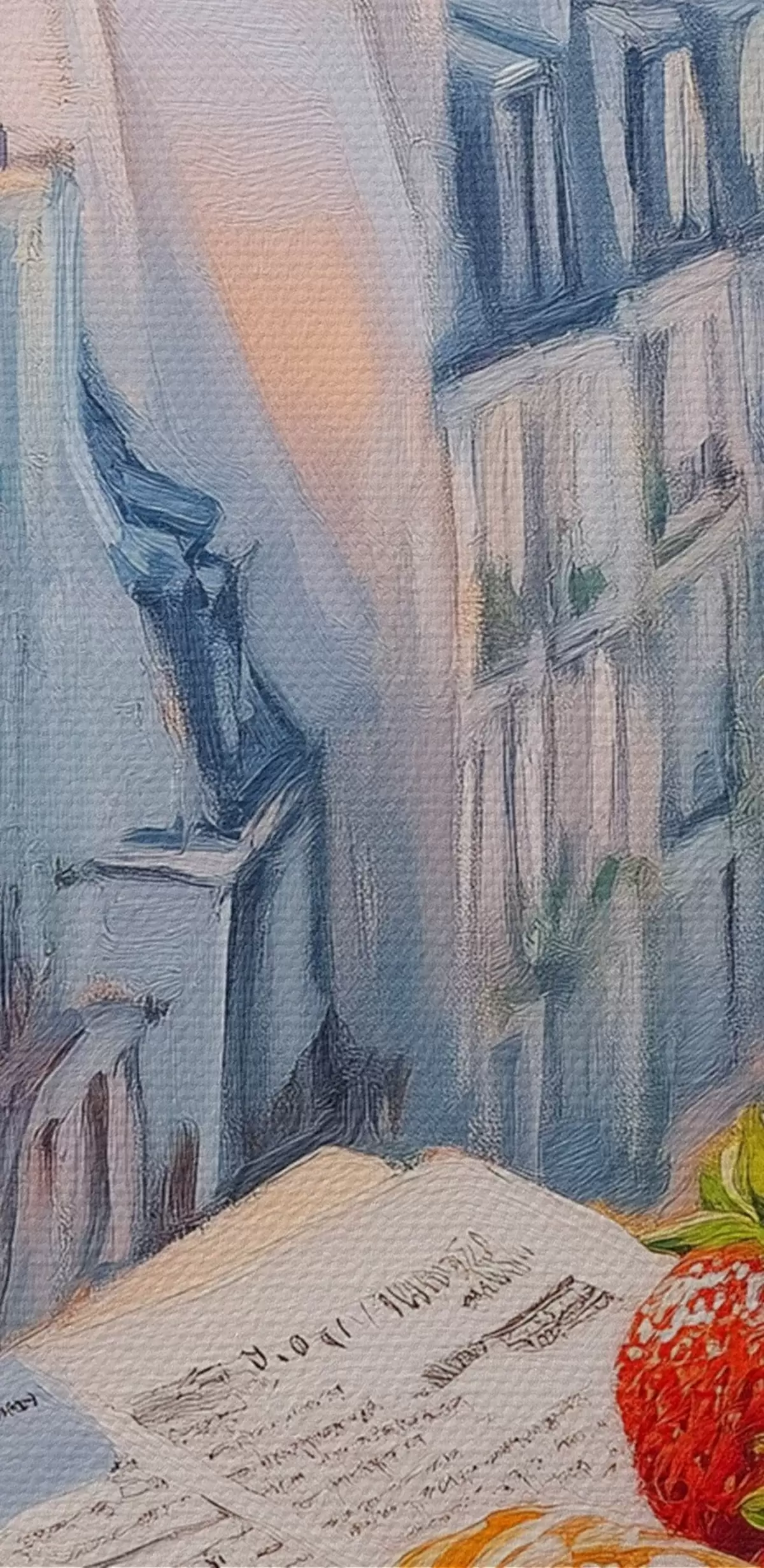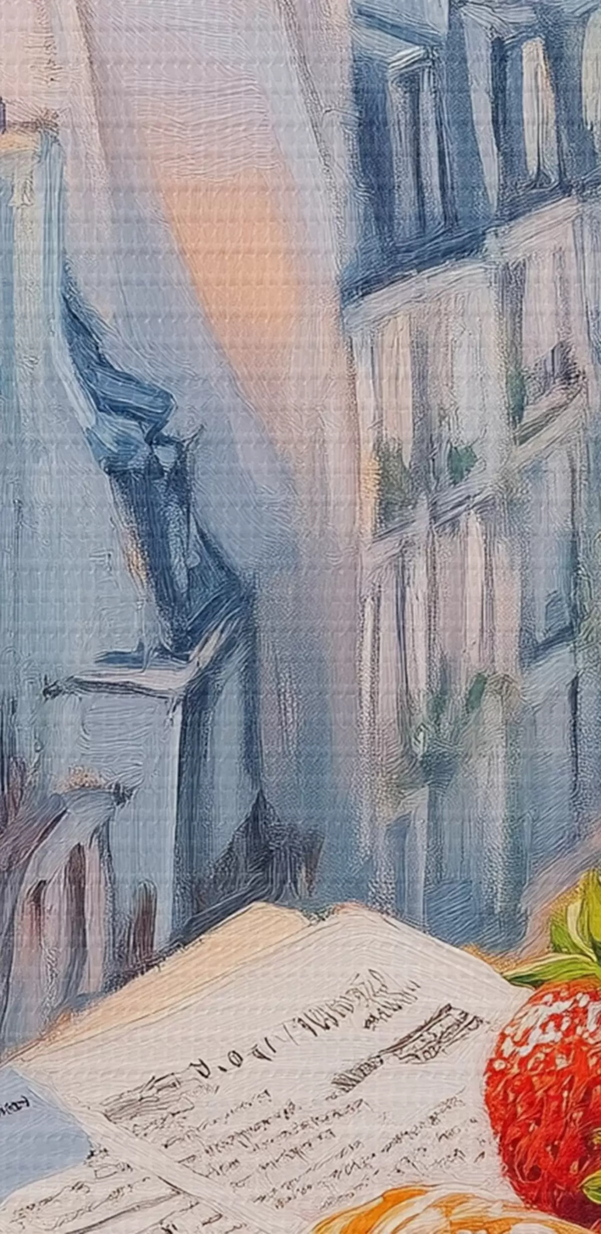 Tableau Lever de soleil sur le balcon à Paris, tour Eiffel, fraises, café, journal Nr s43890