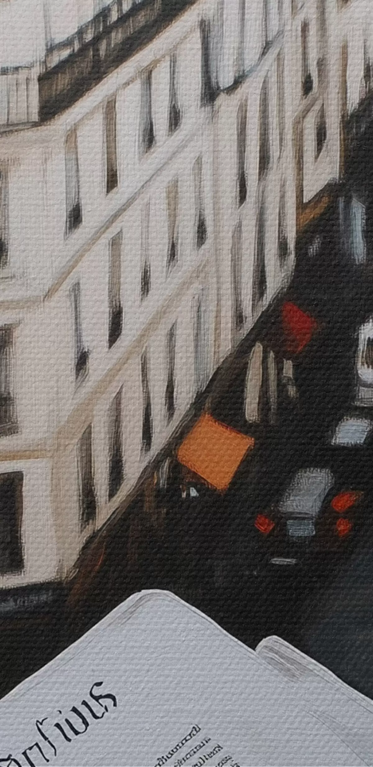Tableau Café matinal avec croissants, rue de la ville, architecture, style huile s43891