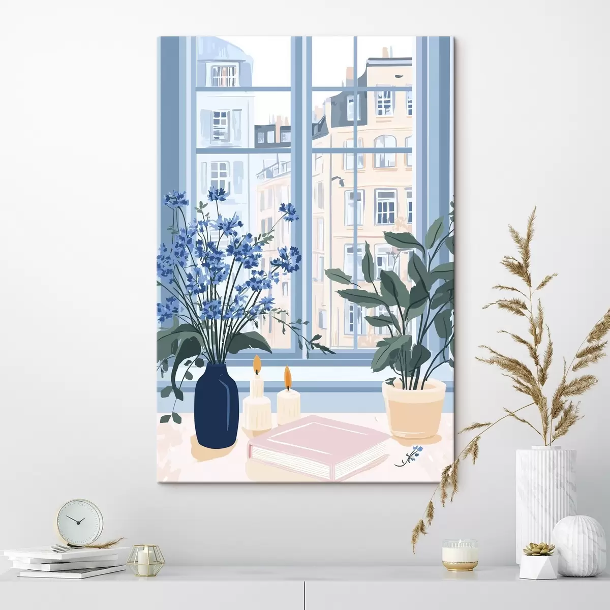 Tableau Maison confortable avec fleurs et vue sur la fenêtre, architecture, couleurs bleues Nr s44010