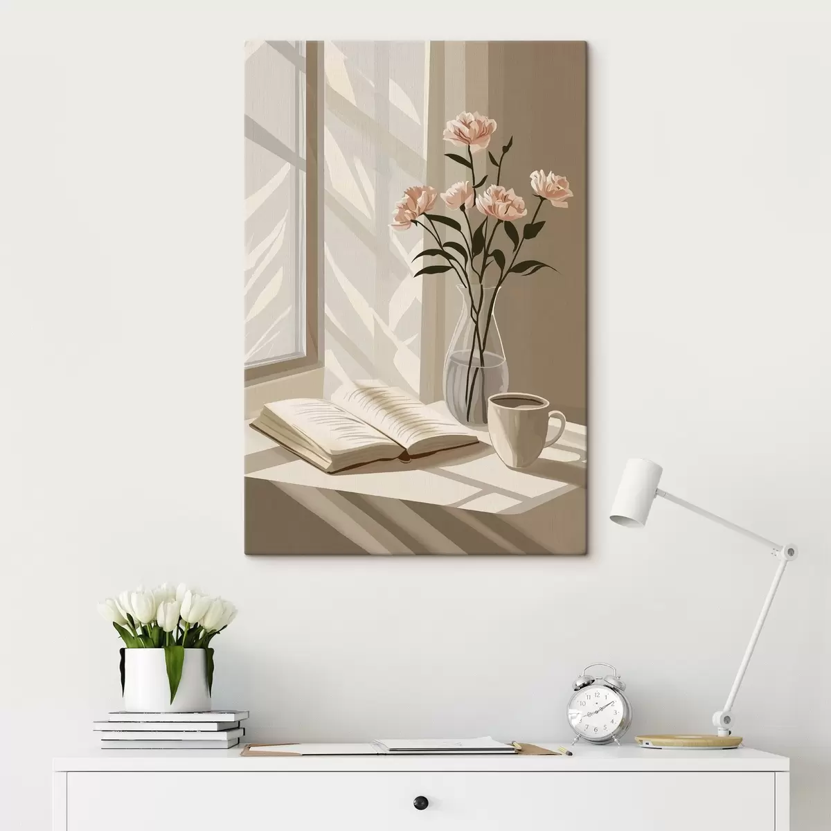 Tableau Matinée agréable avec café et livre, fleurs roses, abstraction s44013