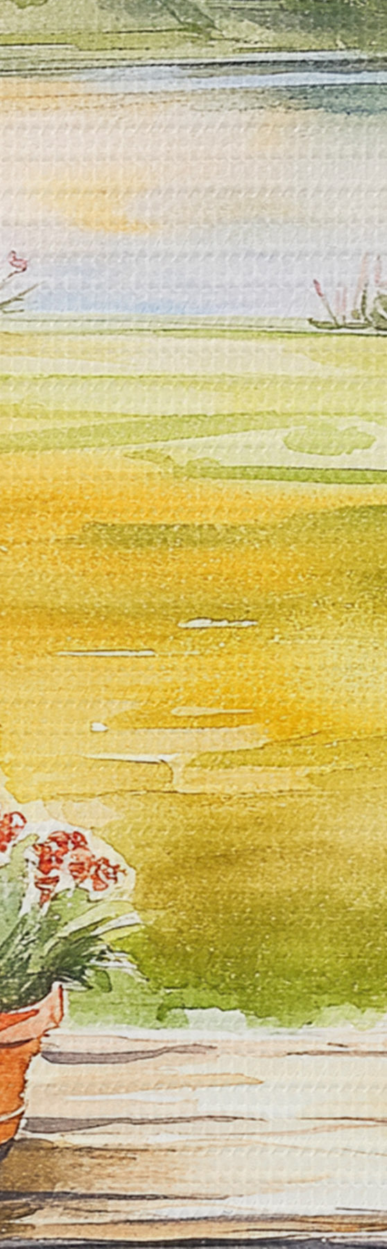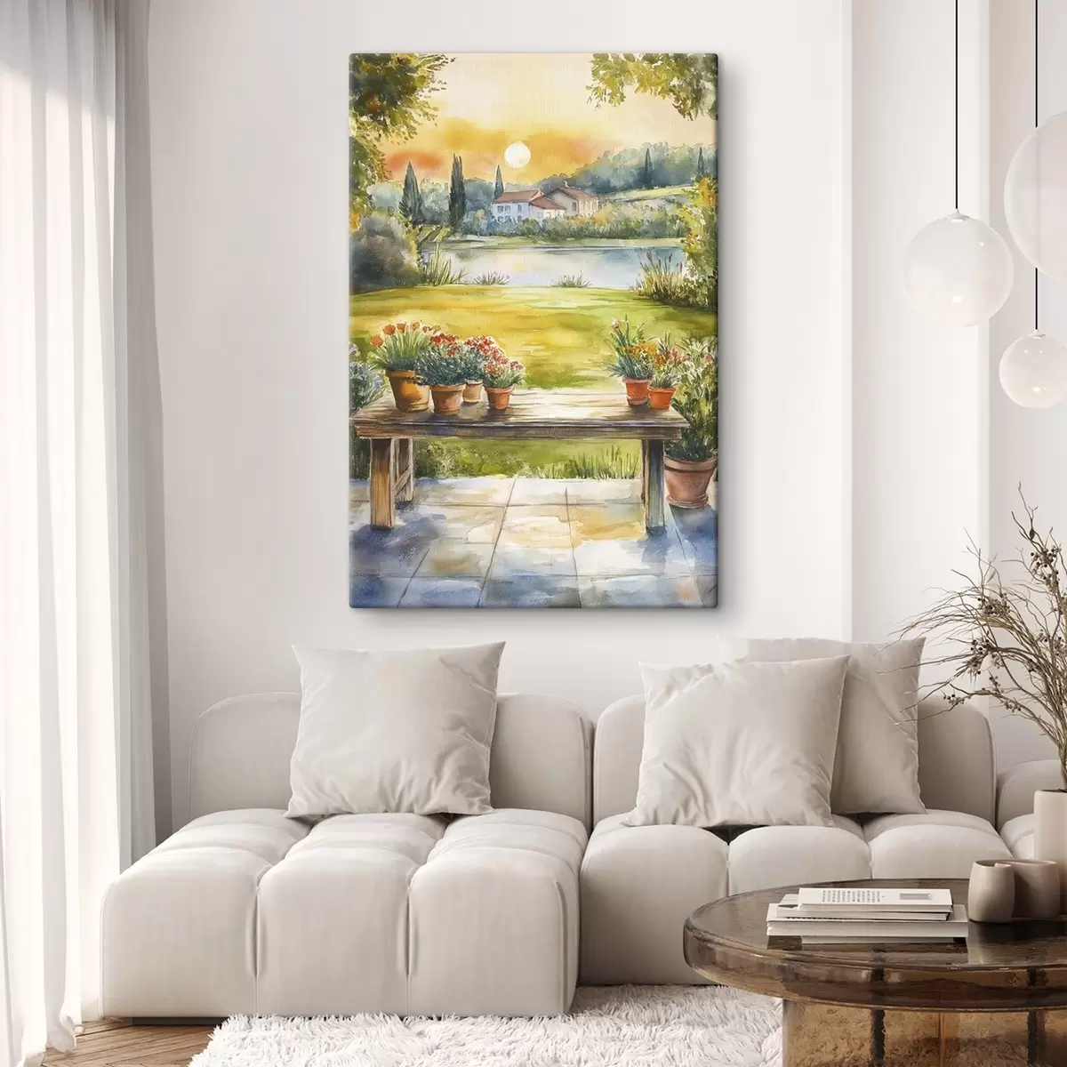 Tableau Village au coucher du soleil, rustique, fleurs d'été, lac, style aquarelle s44016