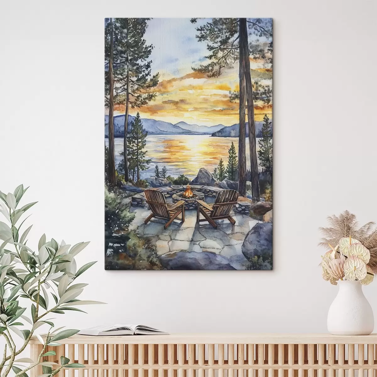 Tableau Lac avec montagnes au coucher du soleil, voyage, cheminée confortable, aquarelle s44018
