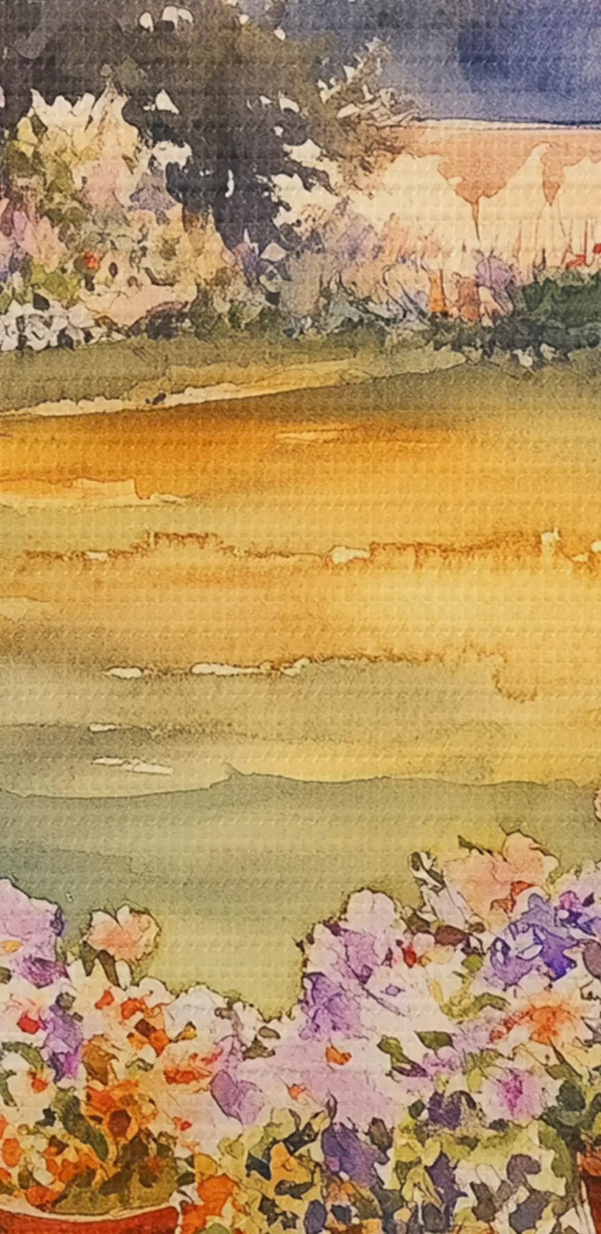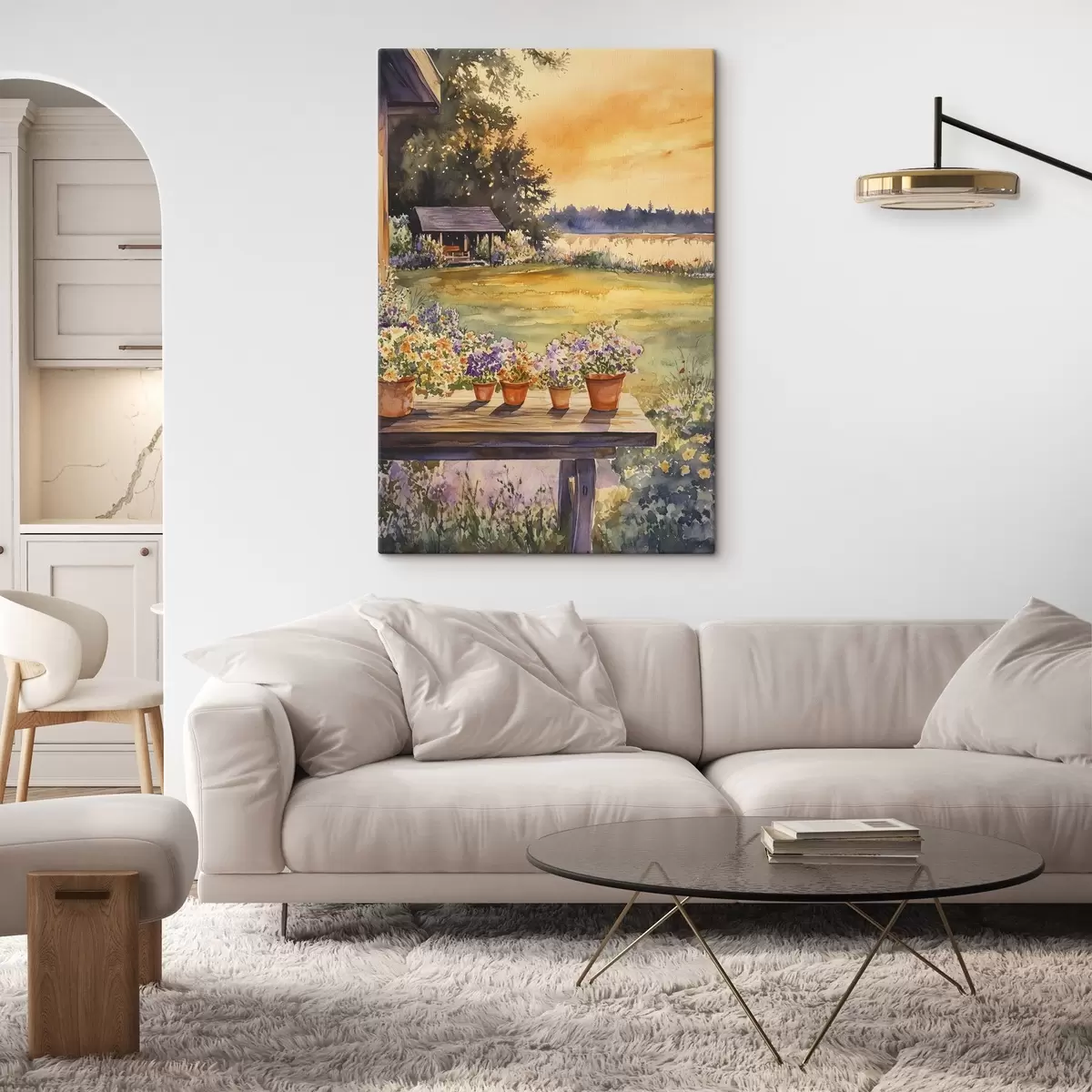 Tableau Fleurs dans le jardin du village, couleurs du coucher de soleil, style aquarelle Nr s44019