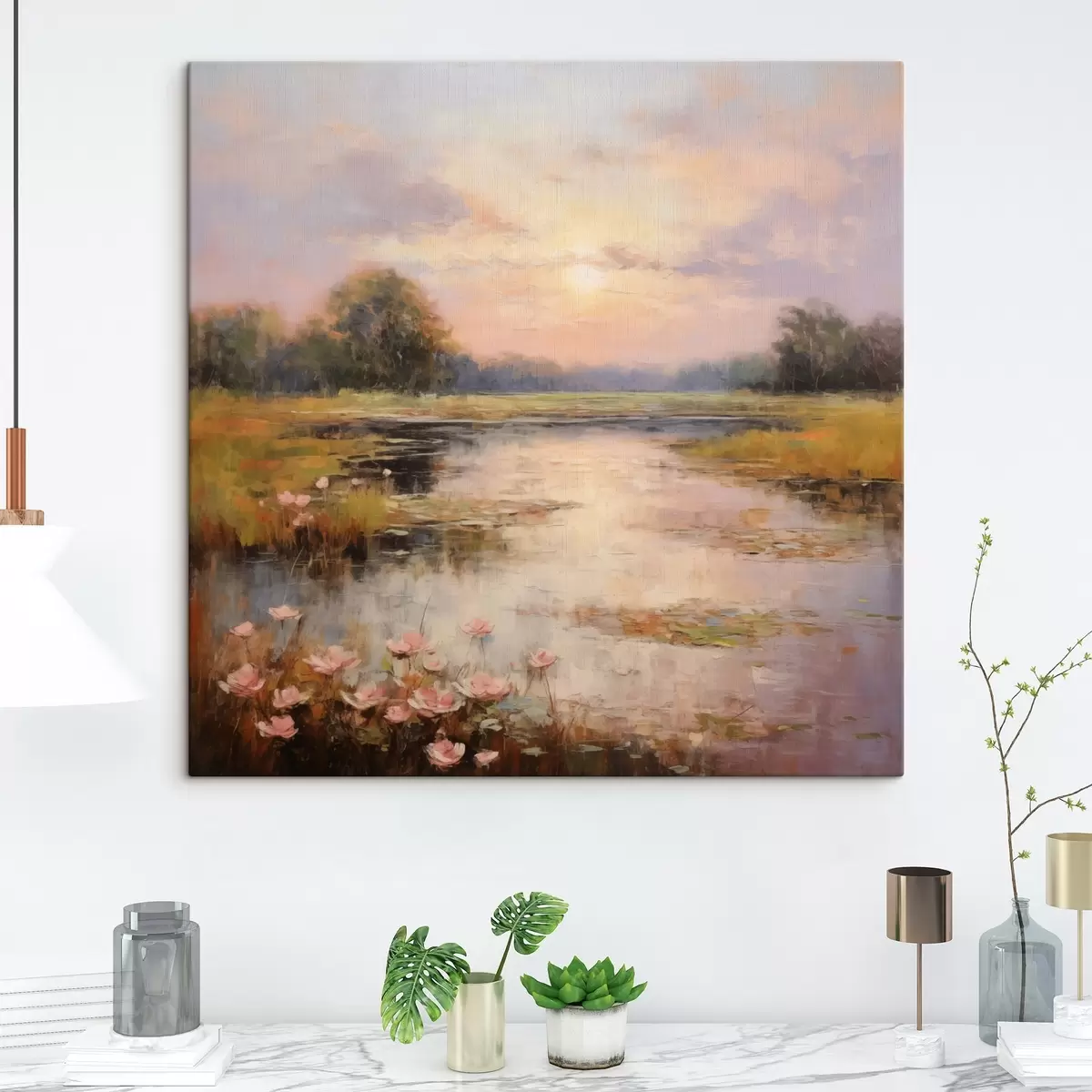 Tableau Plan d'eau avec des fleurs au coucher du soleil s44044