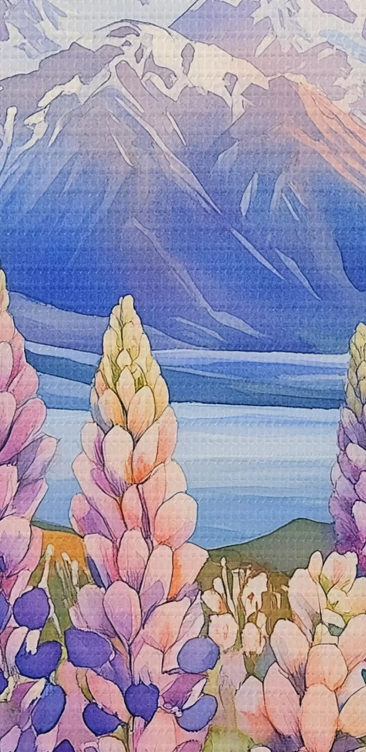 Tableau Fleurs de lupin, prairie, montagnes, style aquarelle, ciel couchant Nr s44146