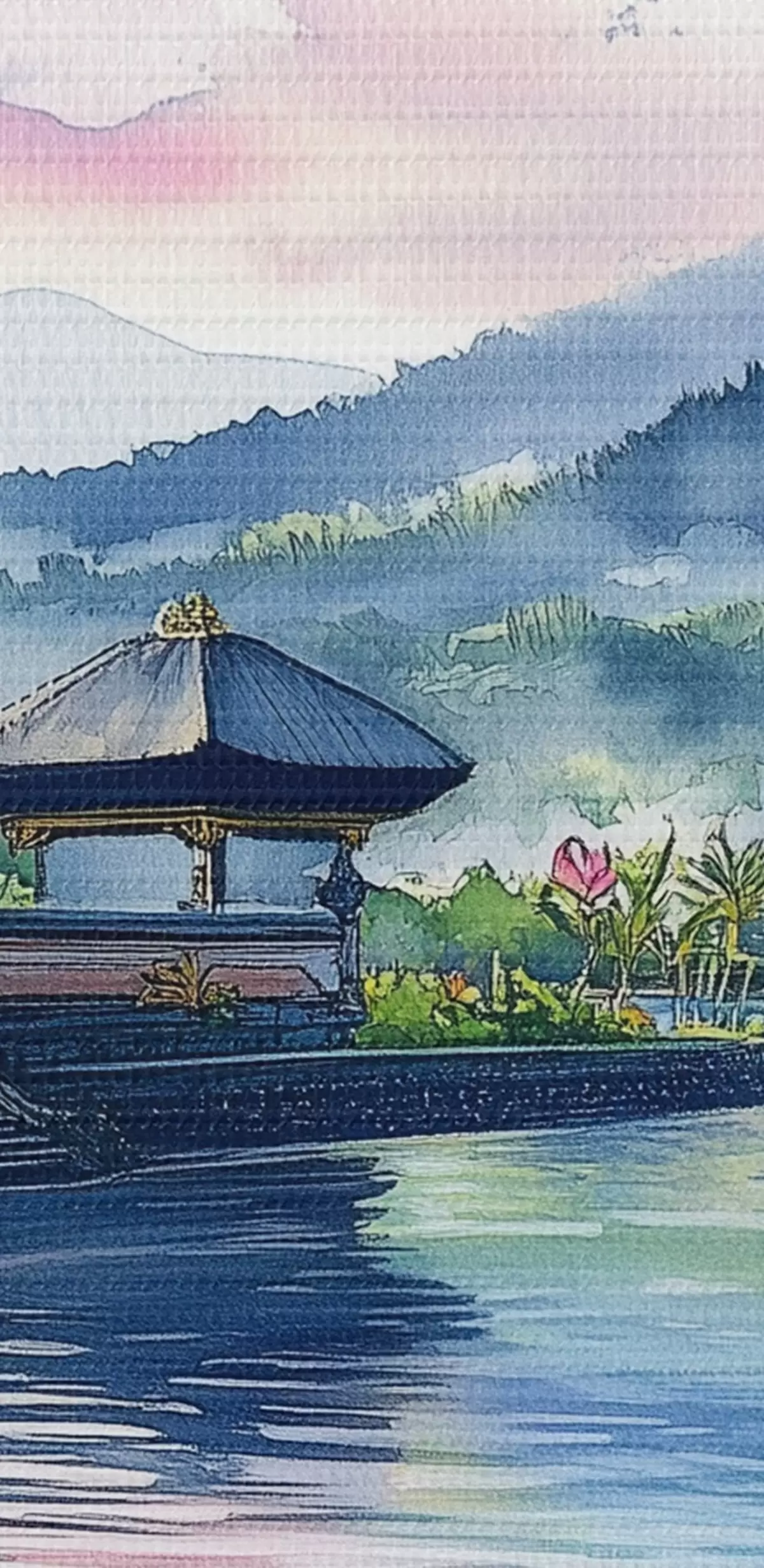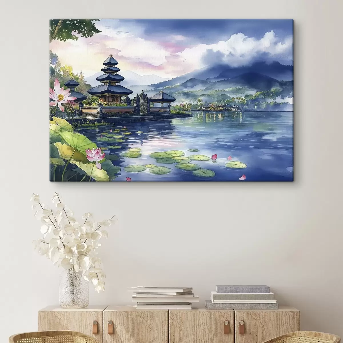 Tableau Île indonésienne, temple, bouddhisme, nature tropicale, style aquarelle s44148