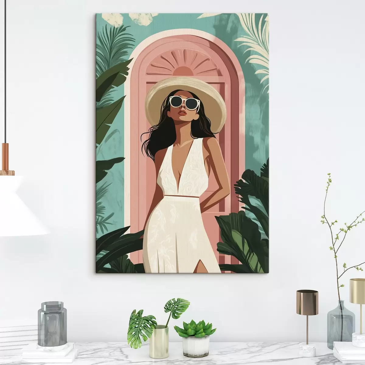 Tableau Femme avec lunettes de soleil et chapeau, nature tropicale, architecture  s44152