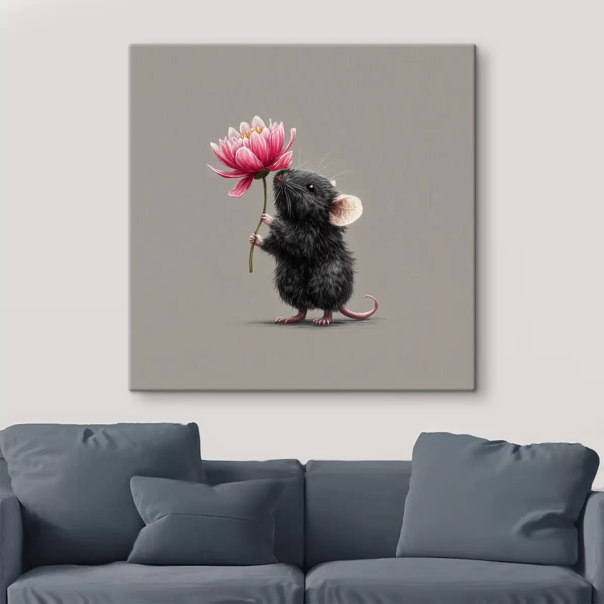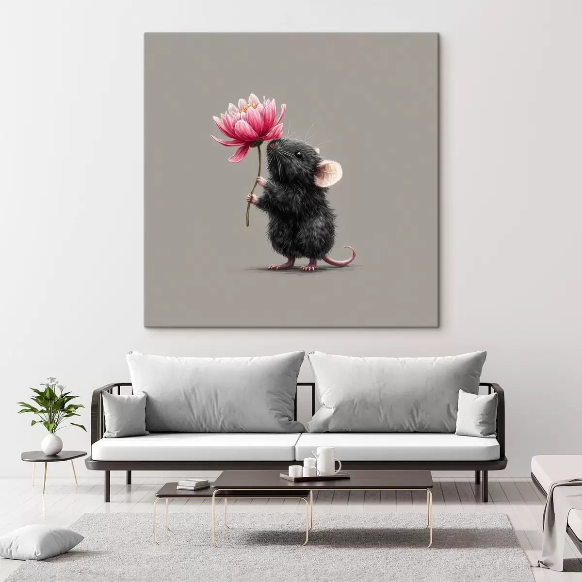 Tableau Charmante souris respirant l'arôme d'une pivoine rose Nr s44248