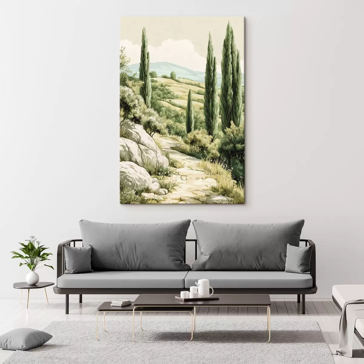 Tableau Paysages d'été avec cyprès et collines verdoyantes, style rustique Nr s44308