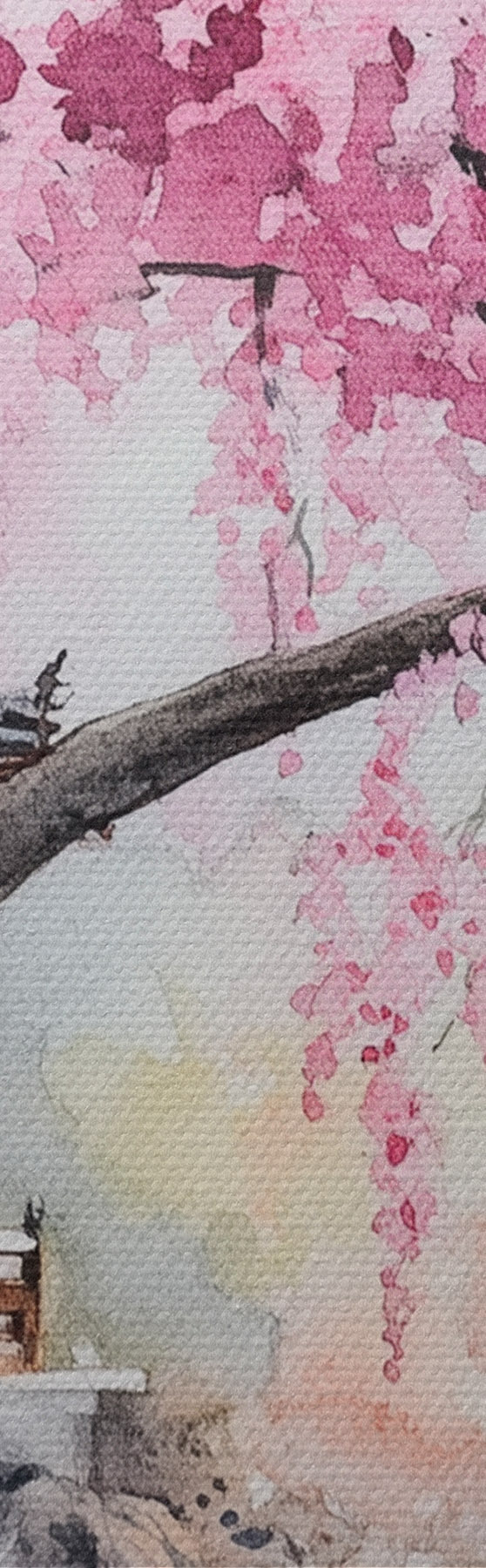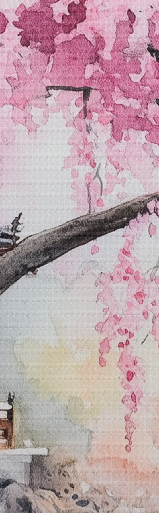 Tableau Cerisier rose près d'une maison sur le lac, Japon, oriental, style aquarelle s44312