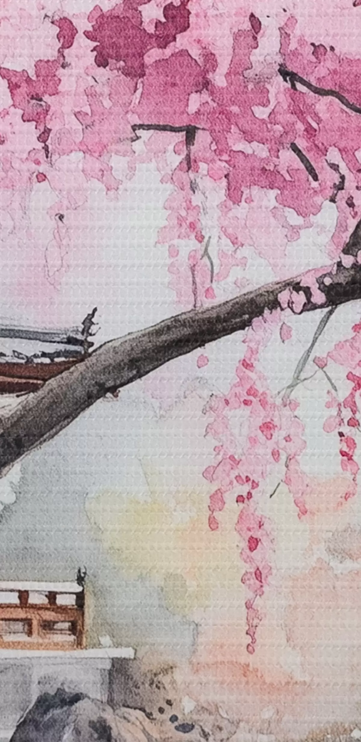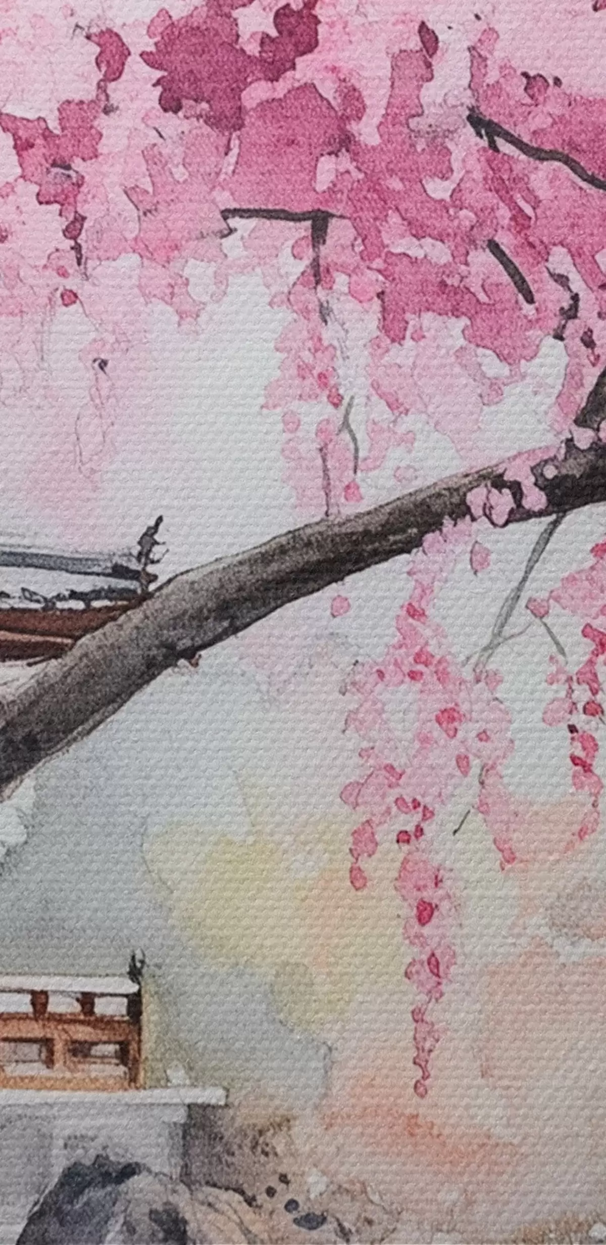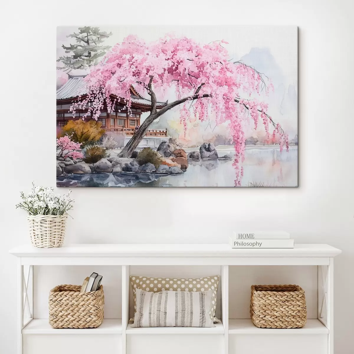 Tableau Cerisier rose près d'une maison sur le lac, Japon, oriental, style aquarelle s44312