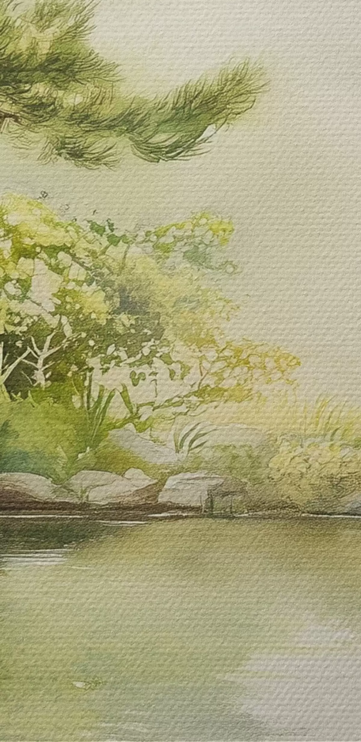 Tableau Jardin oriental avec lac et arbres, nature, style aquarelle s44313